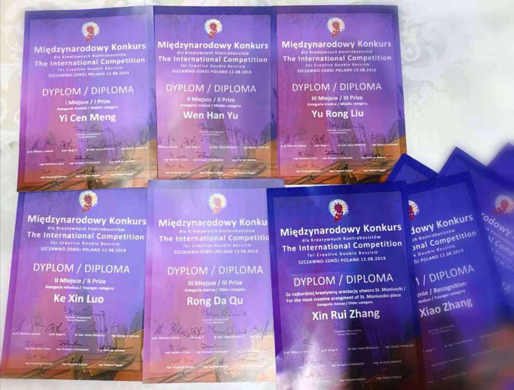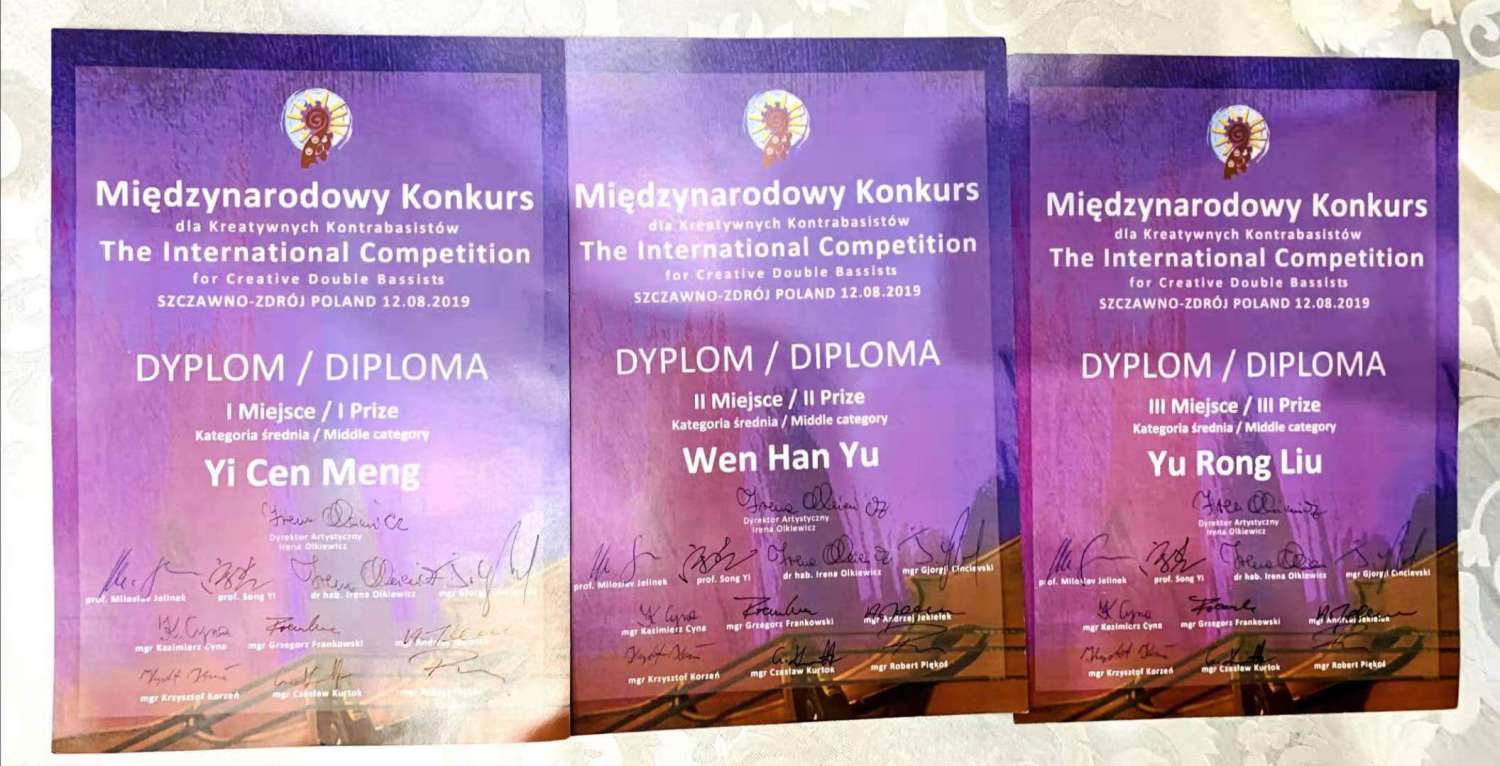 管弦系研究生曲容达、附中校友李子祺荣获成年组并列第三名;本科生纪雯琦获成人组第四名 ; 少年组罗可心同学获第二名;赵可欣、张铎潇同学获并列第四名。