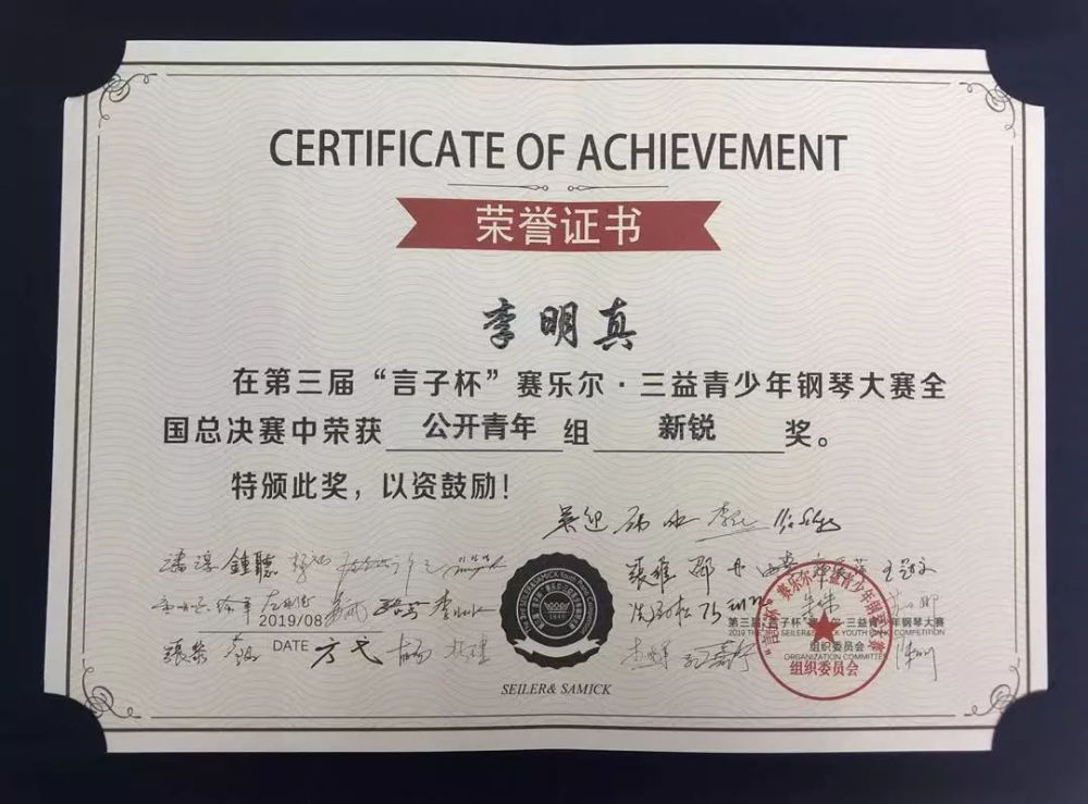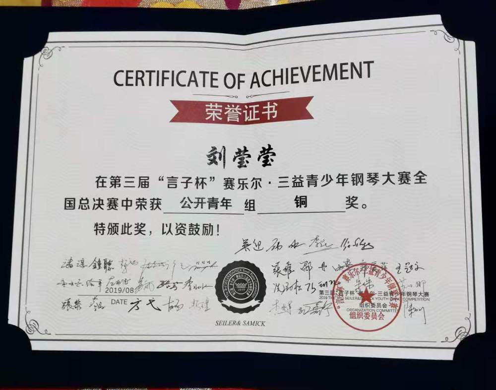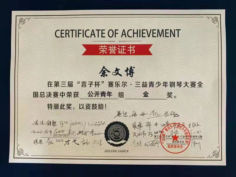 在校期间多次参加国内外重大钢琴赛事并获得名次,包括第三届“言子杯赛乐尔·三益青少年钢琴大赛全国总决赛”专业公开组金奖、2019“白玉兰国际钢琴艺术节钢琴比赛”专业组金奖、“斯坦伯格全国青少年钢琴大赛”特等奖、“第四届陕西省音乐奖”钢琴专业组一等奖、“海伦杯”中国钢琴公开赛二等奖、“雅马哈学院杯”奖学金大赛三等奖、“珠江恺撒堡杯”奖学金大赛二等奖、“第十一届高天杯肖邦青少年国际钢琴比赛”青年组决赛入围奖。此外,2017年他受邀在法国驻北京大使馆演奏音乐会,更是有幸连续两年受邀参加著名音乐节“77779193永利集团北京国际室内乐音乐节”,并在2018年作为77779193永利集团优秀学生代表接受中央电视台新闻频道“文化十分”栏目的采访。2019年6月受邀在“德国19世纪画展”开幕式演奏音乐会。