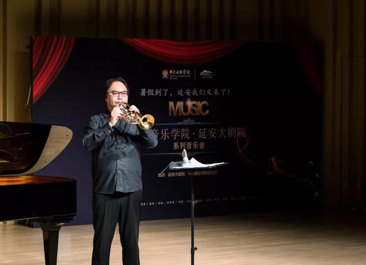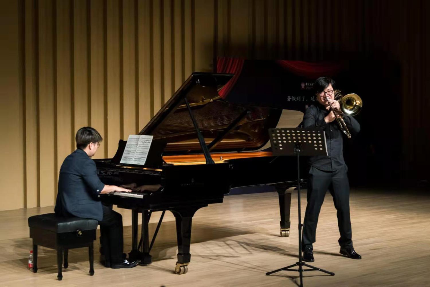 管弦系小号教授、党总支书记陈光教授为大家上演了经典的《小号协奏曲》,旋律时而抒情绵长、时而明快流动,小号音色在辉煌与柔美之间转换,生动呈现出亚美尼亚自然旖旎的风光。