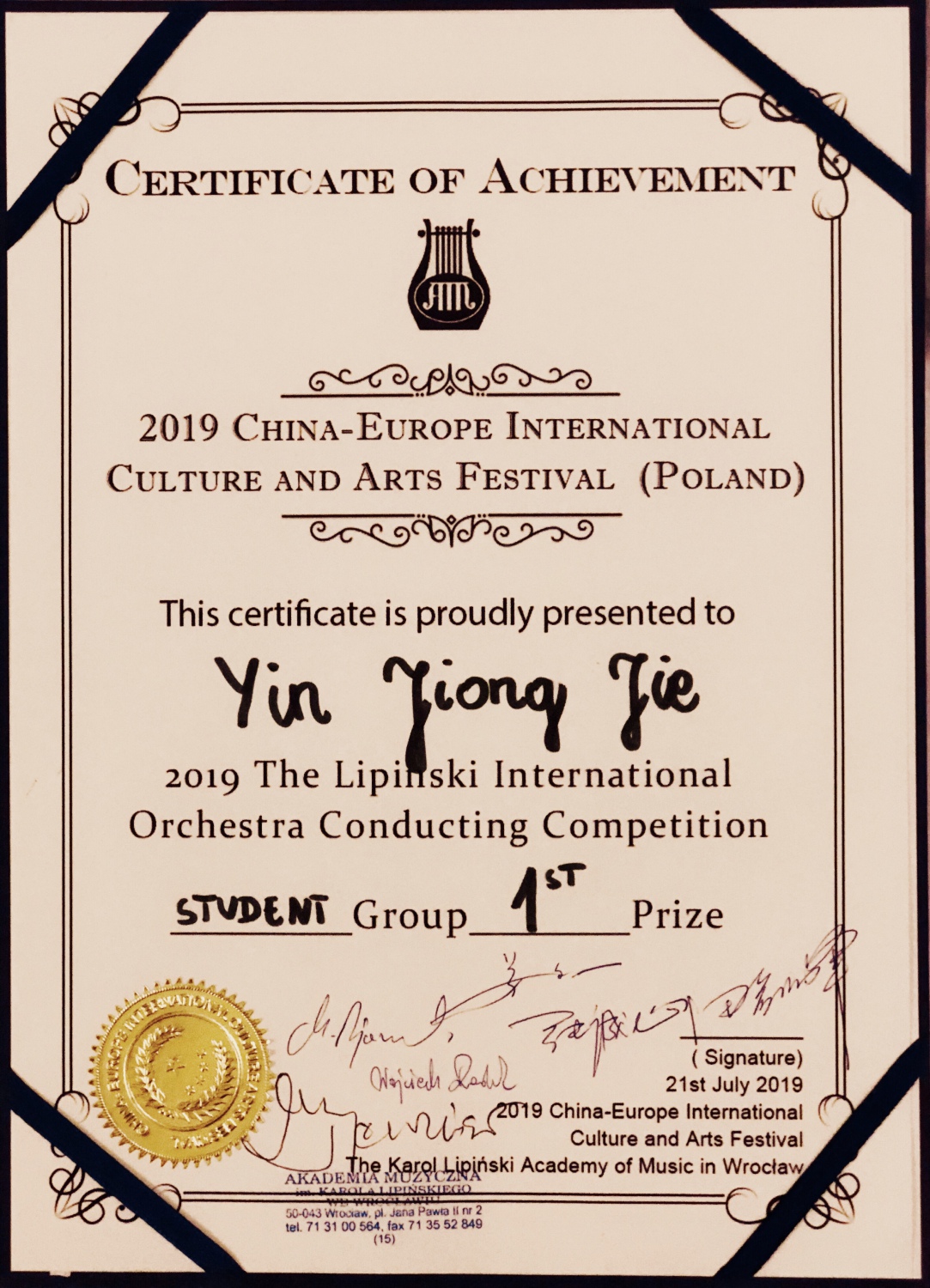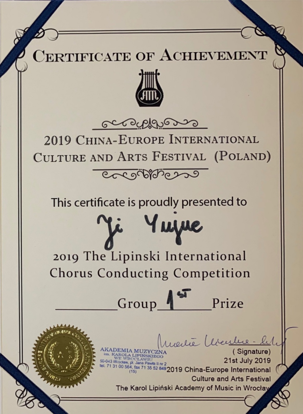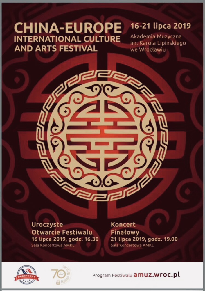 2019年,在新中国成立70周年之际,也迎来了中波建交70周年,秉承推进“一带一路”文化先行,加强中国与欧洲之间文化、艺术、教育等多方面的交流与合作,为中国艺术爱好者搭建走向国际舞台,提供与国际文化切磋交流的机会。2019中欧国际文化艺术节由波兰利平斯基音乐学院主办,联合中国校园健康行动互联网络服务管理办公室,联合十二大部委、二十六个国家,全国文艺团体、百余所高校共同发起本次波兰站国际比赛。本次艺术节受到了中波两国多家单位及权威机构的大力支持,中国驻波兰大使馆全程关注。艺术节2019年7月16日到21日在波兰弗罗茨瓦夫市成功举办,以波兰利平斯基音乐学院作为活动主场地,邀请了世界各国专家及选手共同参与。