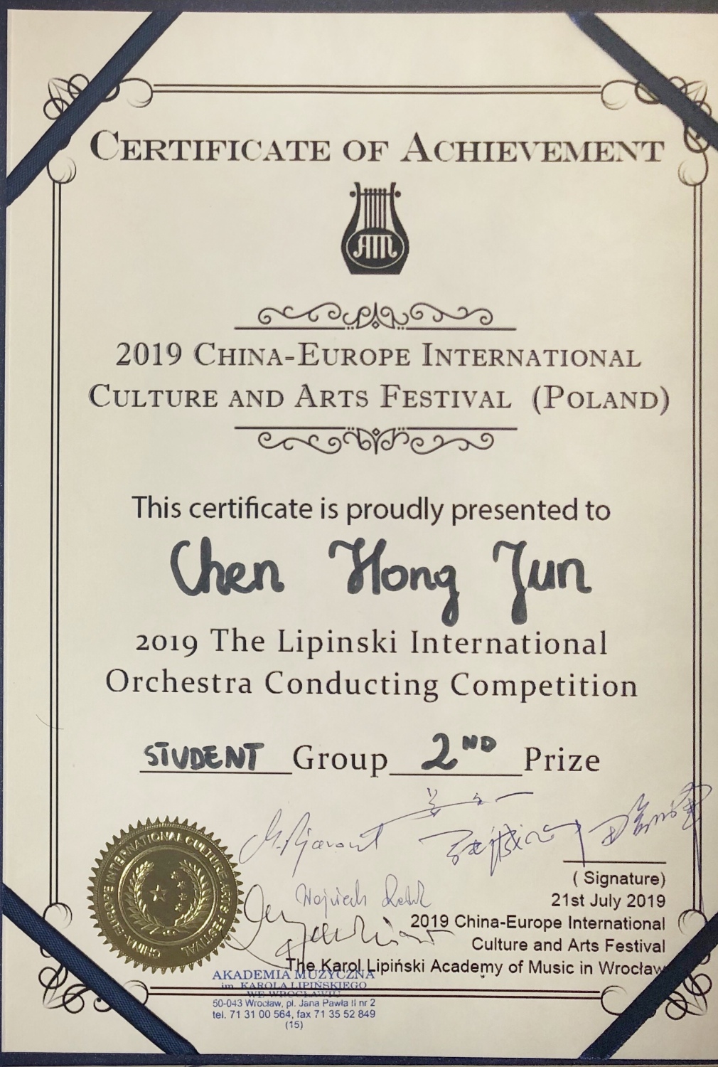 在刚刚结束的弗罗茨瓦夫·利平斯基国际音乐大赛-指挥比赛中,永利指挥系本科一年级学生尹炯杰荣获第一名(金奖)(附中及大学先后师从陈冰(大)教授、陈琳教授),本科四年级学生陈弘俊(附中及大学先后师从陈冰(大)教授、夏小汤教授)荣获第二名(银奖)。第三名(铜奖)由研究生一年级学生张峥(本科及大学师从夏小汤教授)获得。合唱指挥笫一名(金奖)由中国国家交响乐团合唱团常任指挥(永利指挥系毕业生,先后师从俞峰教授、夏小汤教授)纪玉珏获得。