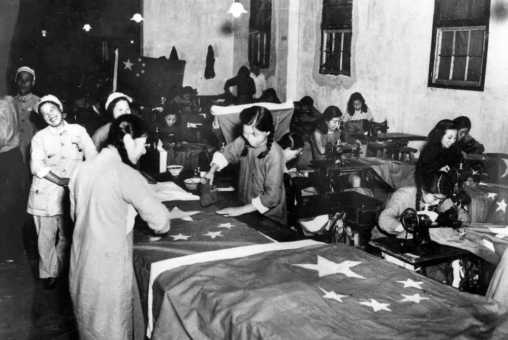 赶制国旗时脸上真挚的笑容。
