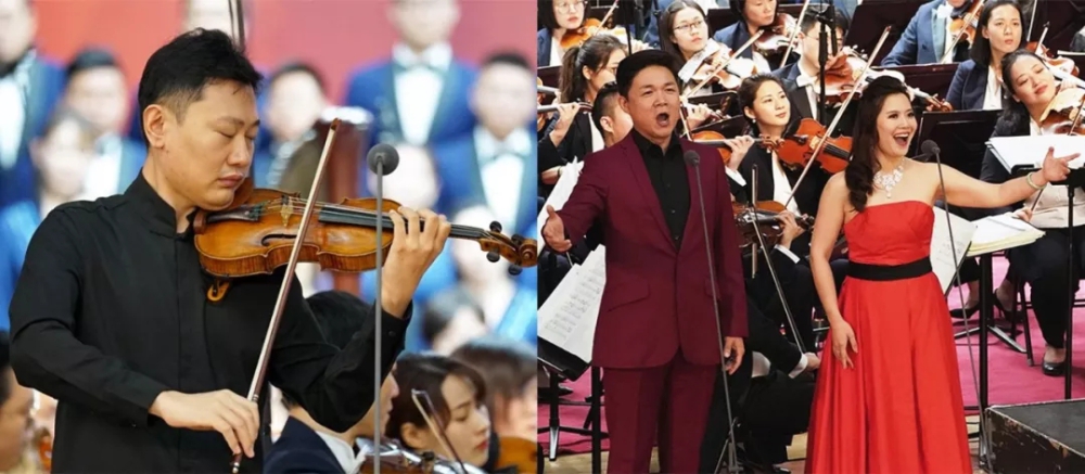 担任《梁祝》小提琴独奏的陈曦(上左),17岁就获得第12届柴可夫斯基国际音乐比赛小提琴银奖,那届金奖可是空缺的哦。 青年男高音歌唱家王传越(右图左)曾获2015年第15届柴可夫斯基大赛银奖,女高音歌唱家宋元明(右图右)曾获第48届法国图卢兹国际声乐大赛第一名。