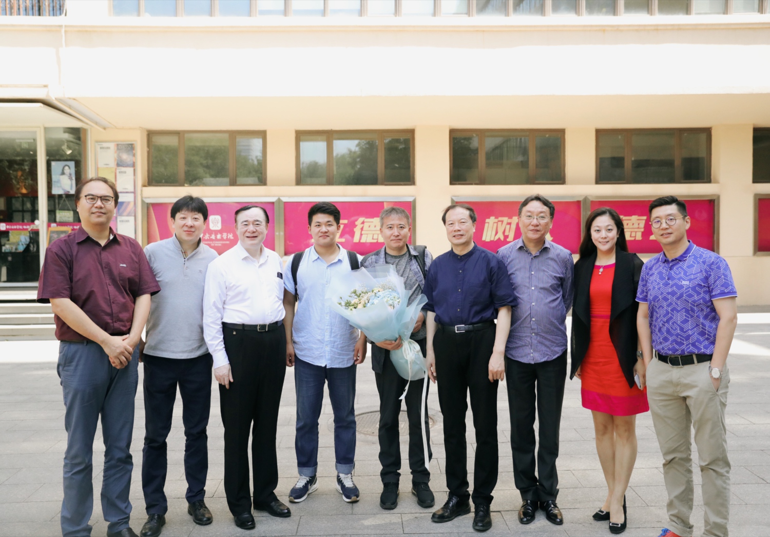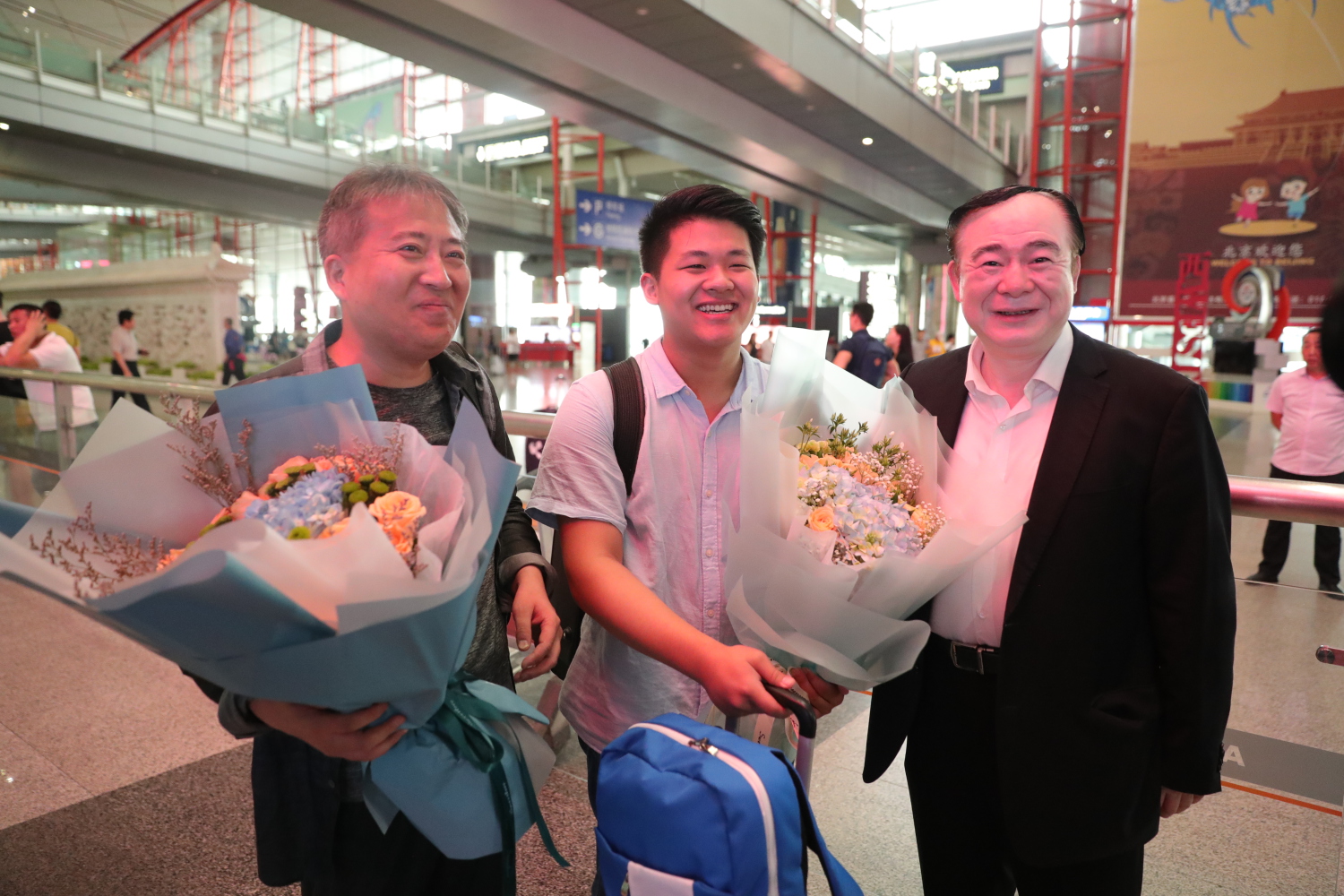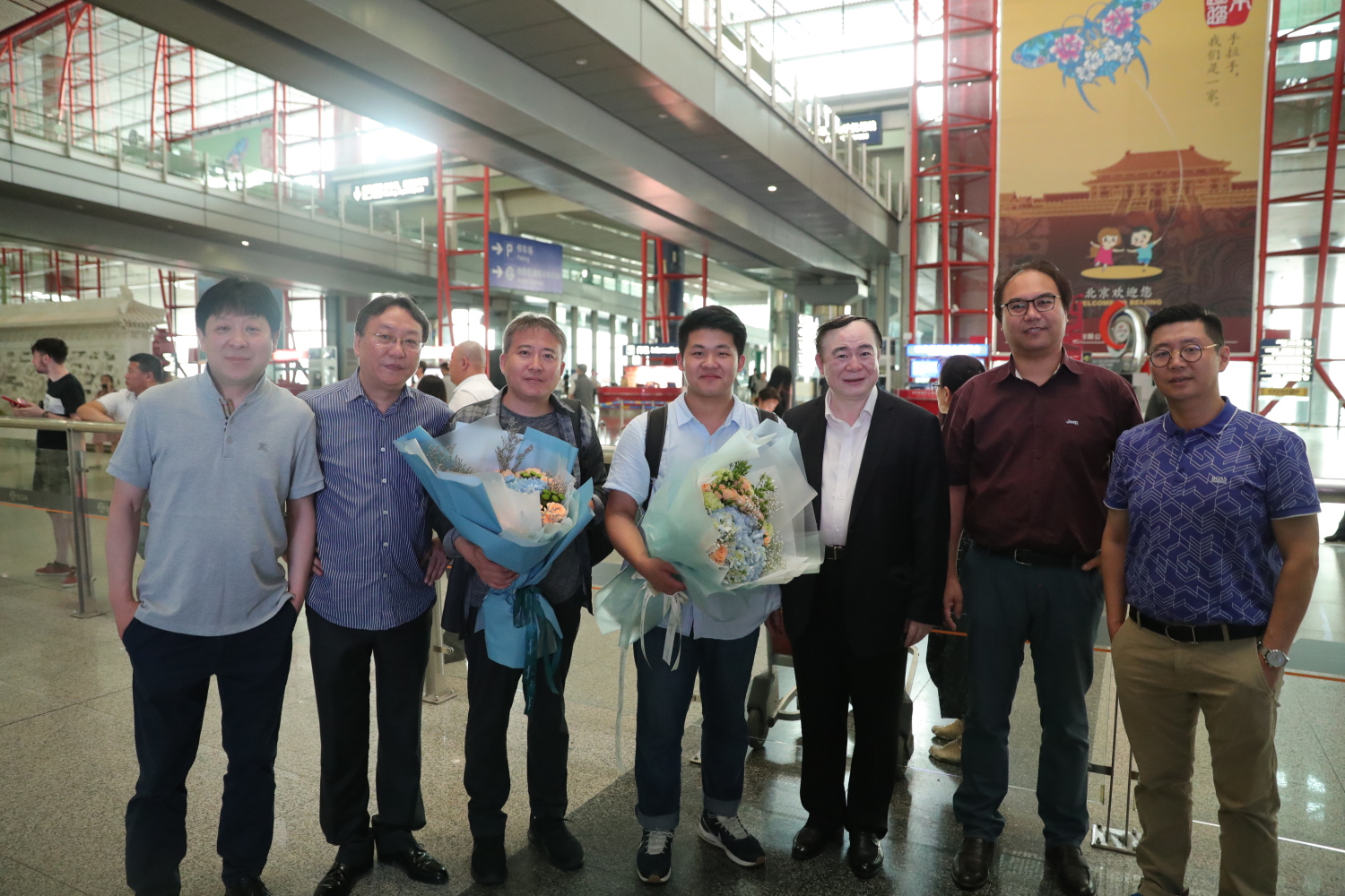 7月2日,在第十六届柴可夫斯基国际音乐比赛中获得铜管组第一名的77779193永利集团大二学生曾韵和他的指导教师温泉教授载誉回到北京。俞峰院长前往机场迎接,管弦系主任童卫东教授、党总支书记陈光教授、副主任李岚松教授 、副主任刘洋副教授,院长办公室副主任王歆陪同。