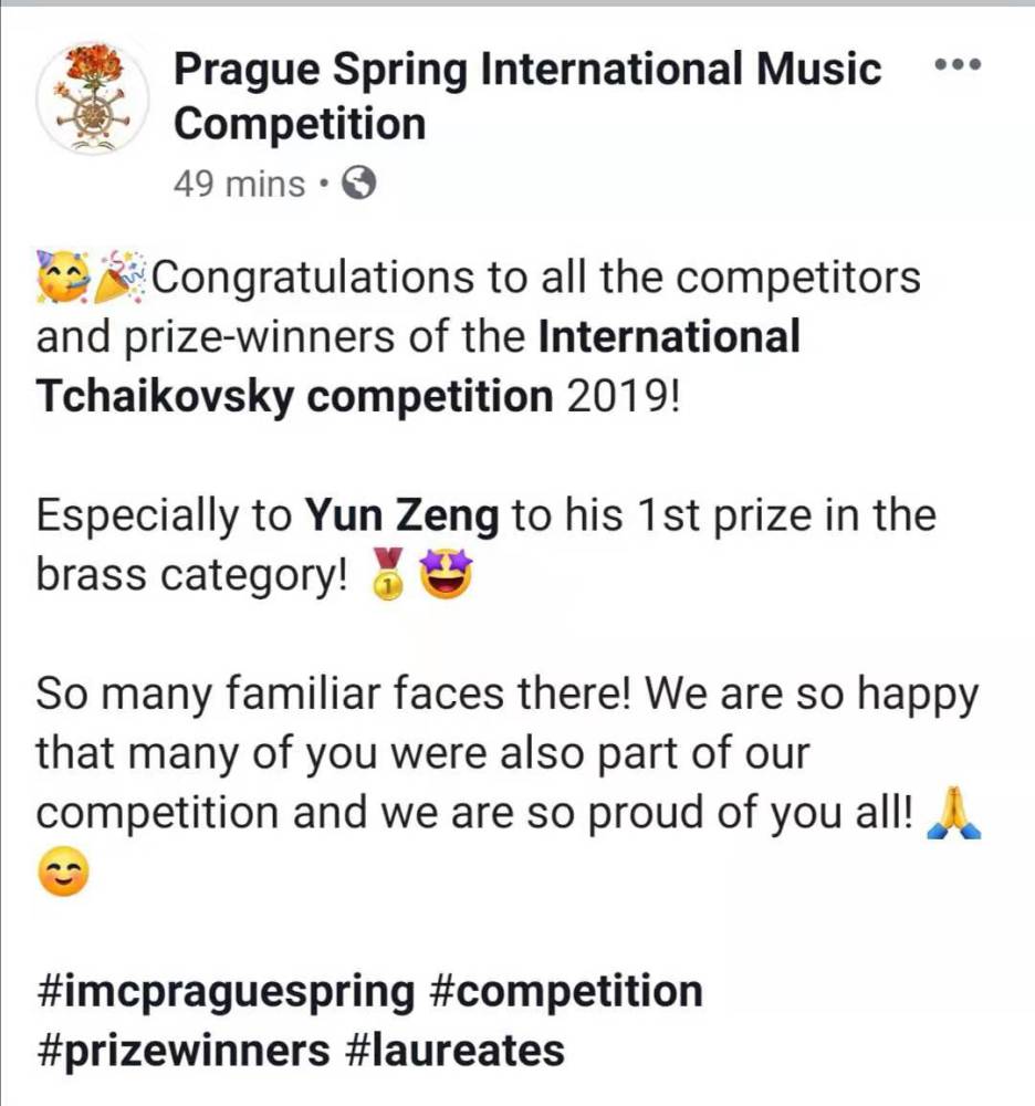 “布拉格之春”国际音乐比赛官方也发来了对曾韵的贺电: