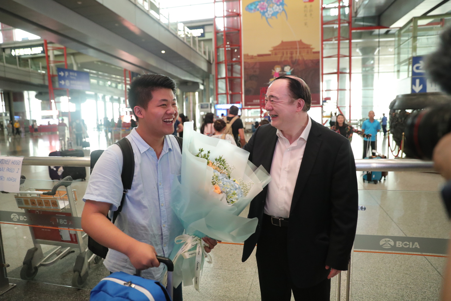 新华社记者一行也陪同前往接机,并对俞峰院长、曾韵同学与温泉教授、童卫东教授进行了专访,精彩内容请等待官微的后续报道!