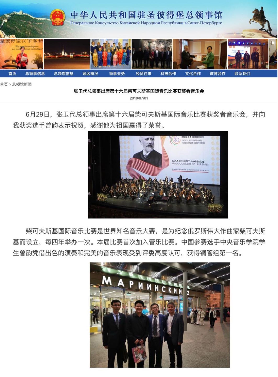 6月29日,中国驻圣彼得堡总领事馆张卫代总领事出席了第十六届柴可夫斯基国际音乐比赛获奖者音乐会,向获奖选手曾韵表示祝贺,感谢他为祖国赢得了荣誉。