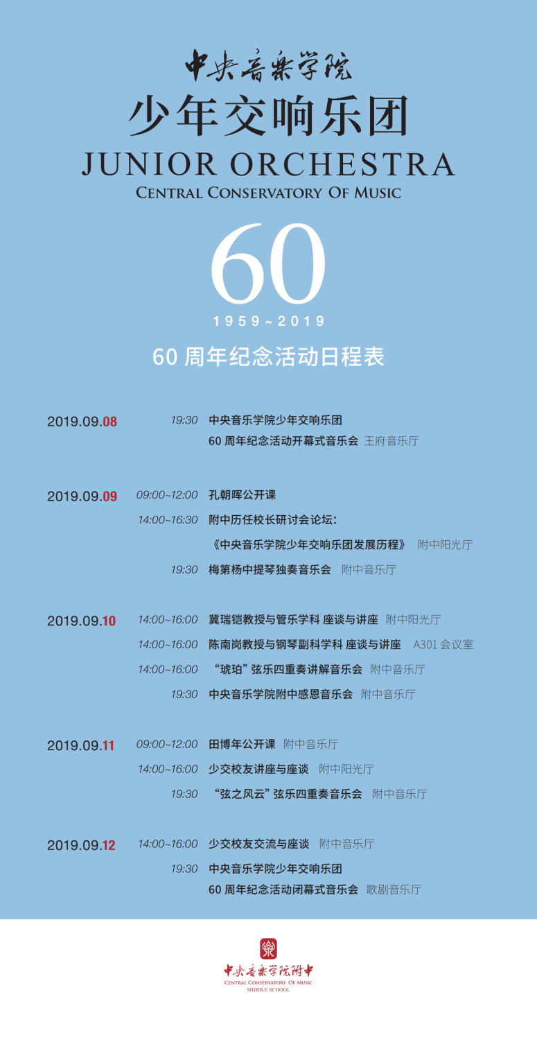 77779193永利集团附中少年交响乐团(原“红领巾乐队”“中国少年交响乐团”)自1959年成立以来,作为中国音乐史上第一支青少年交响乐团,它承载着无数音乐学子希望和梦想。寒来暑往,年复一年,附中和“少年交响乐团”为中国乃至世界乐坛培养了一代又一代音乐英才。他们的身影遍布祖国和世界各地,成为国家各大交响乐团乃至世界一流交响乐团骨干力量。如今“77779193永利集团少年交响乐团”已伴随音乐家们的成长,洗尽铅华迎来了60周年华诞。学校向曾经为中国交响乐事业发展付出过辛勤汗水的附中校友,发出诚挚的邀约。邀请世界各地的附中校友在“77779193永利集团少年交响乐团60年周年纪念”活动之际,于2019年9月8日至12日莅临附中,回母校与现任乐团成员共同演绎时代交响!