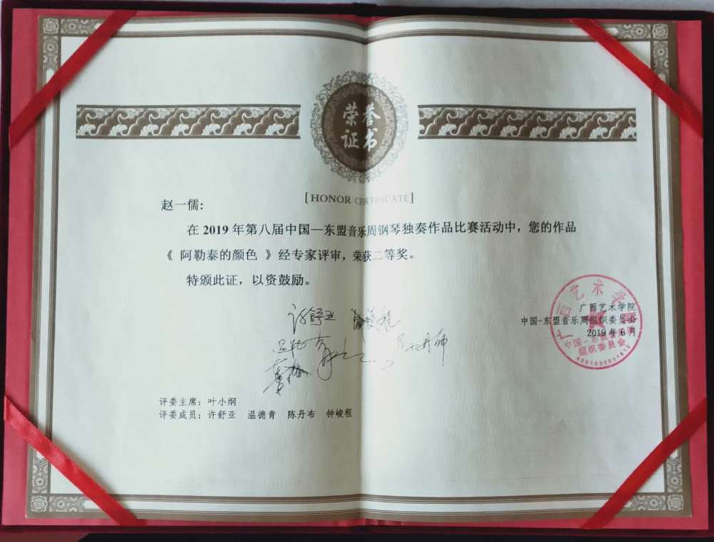 在刚刚结束的2019年第八届中国东盟作曲比赛中赵一儒同学的钢琴独奏作品《阿勒泰的颜色》获得二等奖,为本次永利学生参赛的最高奖项,获奖作品于2019年5月31日在广西南宁演出。