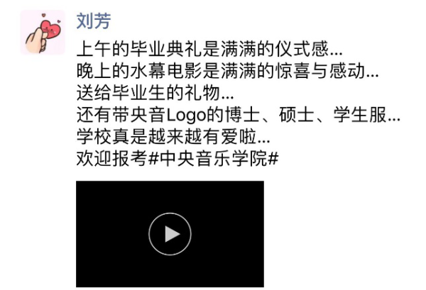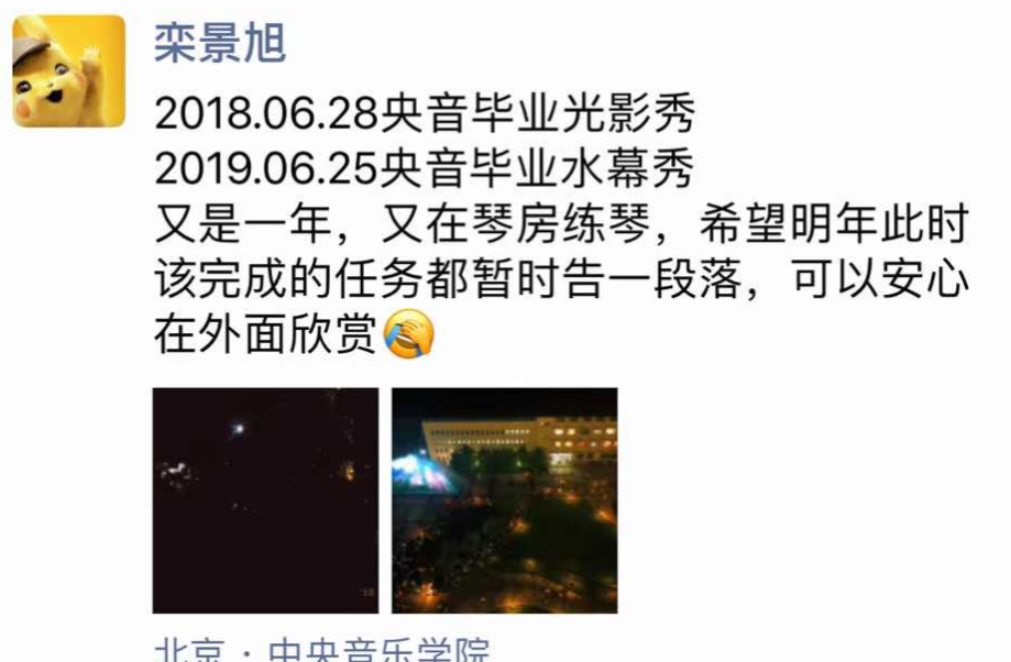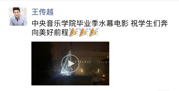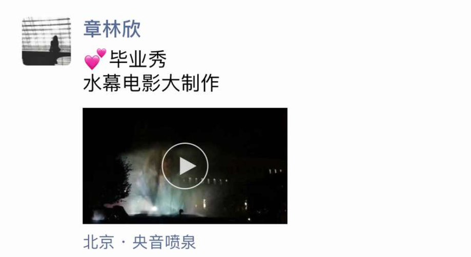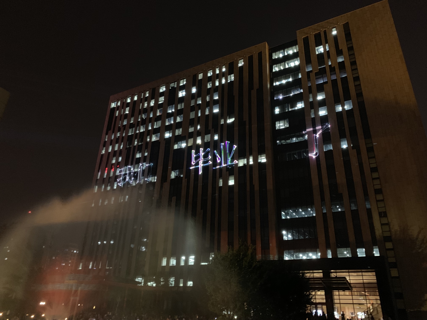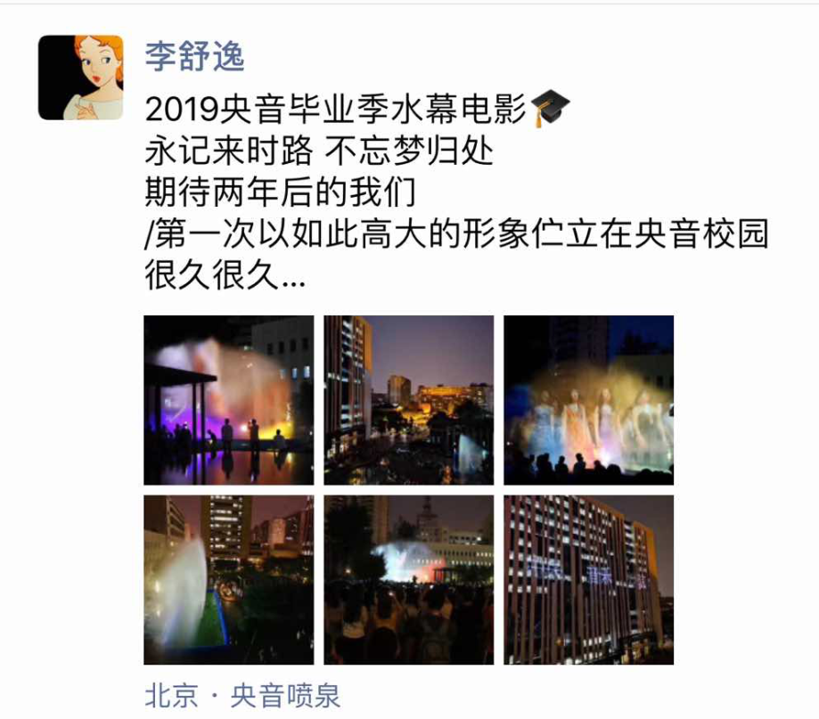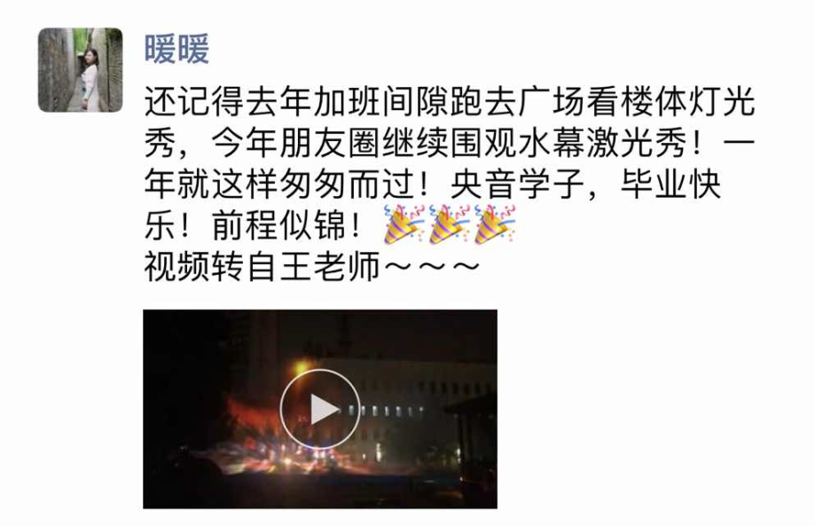 演出最后,2019届毕业典礼的视频片段在水幕里出现,《友谊地久天长》的歌声回荡在校园,教学楼上方打出激光投影“我们毕业了”、“我爱你央音”,表达了同学们学业有成的欢欣和惜别母校不舍的深情。