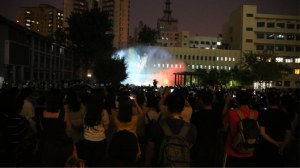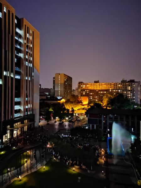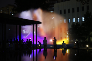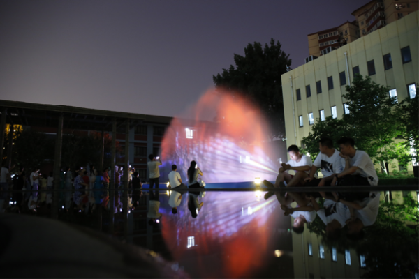 8点30分,30米宽、20米高的水幕在图书馆前的平地升起,“倒数视频”和“激光喷泉秀”点燃了观众的热情,数百名师生观众发出阵阵欢呼。