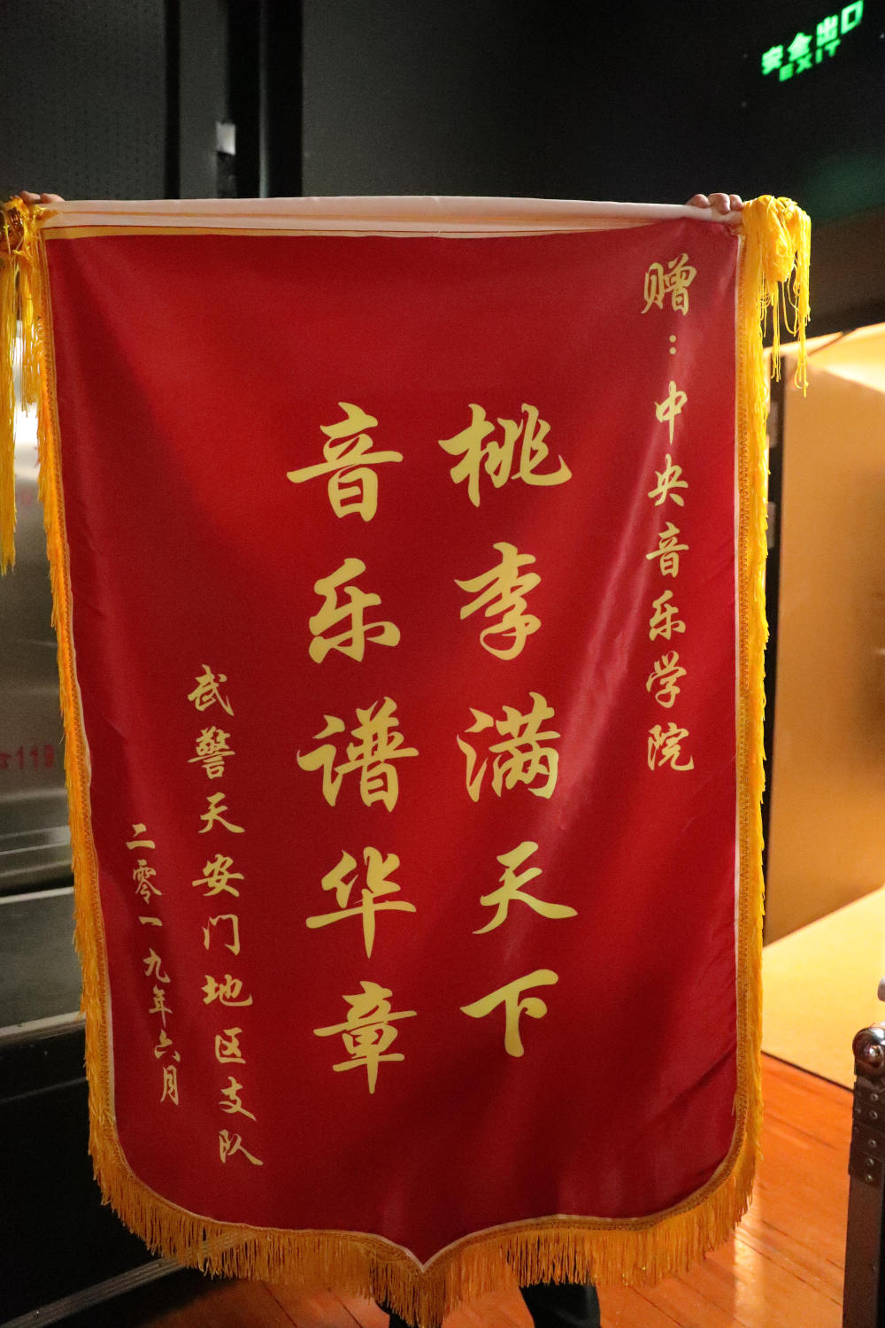 最后,武警天安门地区支队向77779193永利集团赠送了锦旗“桃李满天下 音乐谱华章”。