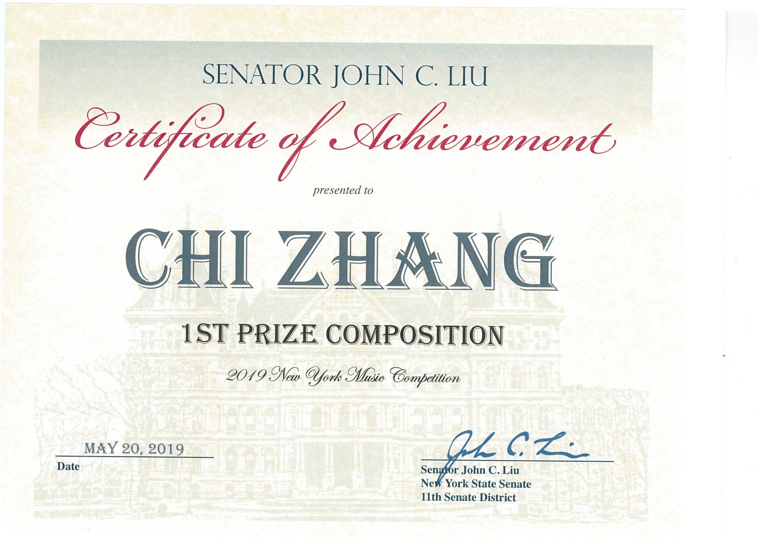 2019年4月,张驰所创作的钢琴独奏作品《Ship of Theseus》(忒休斯之船)在第22届纽约国际音乐比赛中荣获作曲A组(13-17岁)第一名,并获得了主办方发出的赴纽约演奏获奖作品的邀请。这项赛事旨为年轻音乐家们提供发现他们音乐潜力的机会。