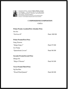 同时,该作品以94分的成绩(满分100分)获得了第29届意大利“巴列塔之城”国际青少年音乐家比赛作曲A组(独奏乐器组,无年龄限制)二等奖的好成绩。该比赛为全球著名的青少年音乐大赛之一,本届参赛选手来自60多个不同的国家和地区。