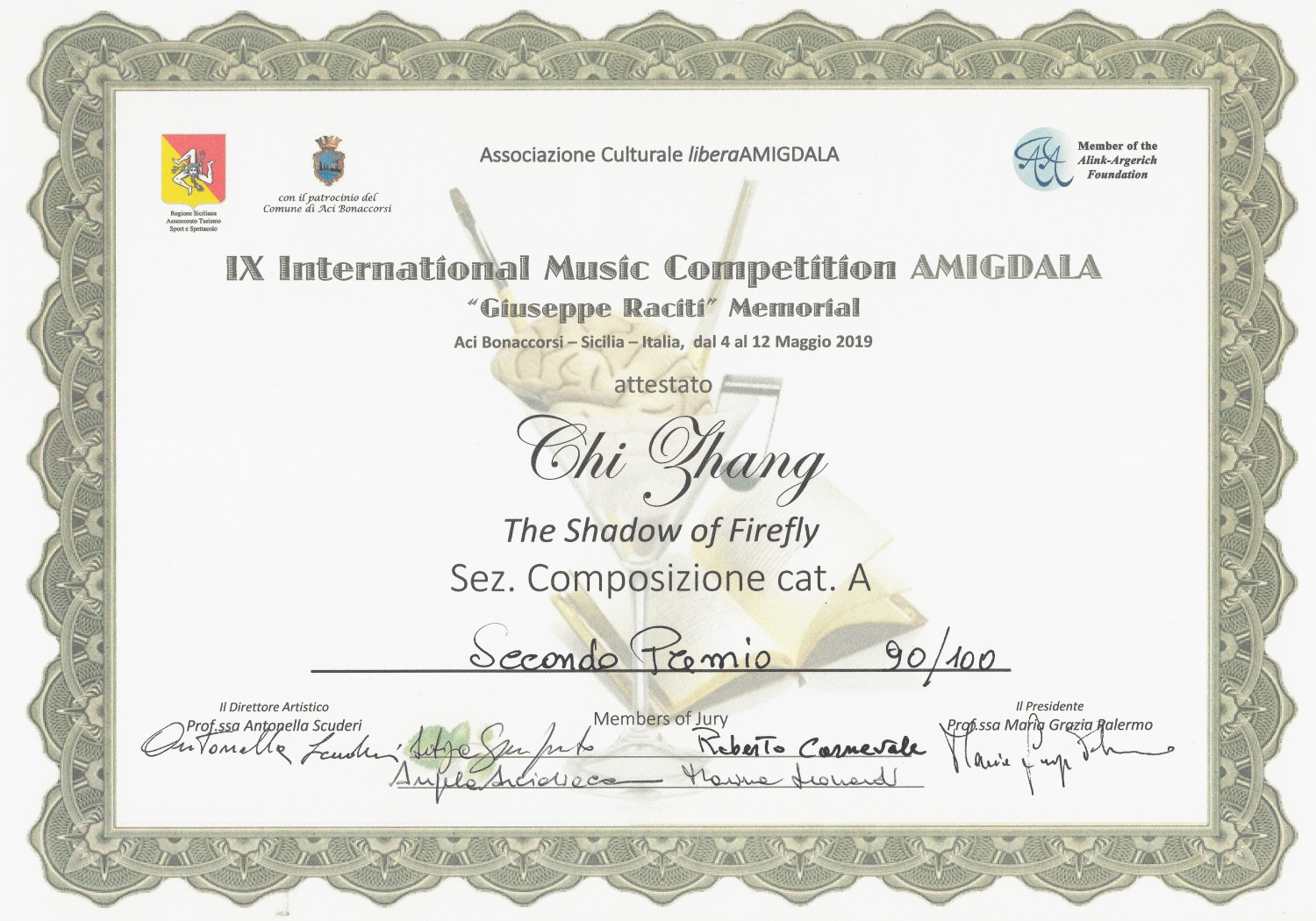 2019年5月,张驰的另外一首钢琴作品《The Shadow of Firefly》(耀影)获得了第9届阿米加拉国际音乐比赛作曲A组(独奏乐器组,无年龄限制)二等奖。这项比赛是在意大利举办的每年一度的国际性音乐比赛,得到当地政府和很多音乐家的大力支持。