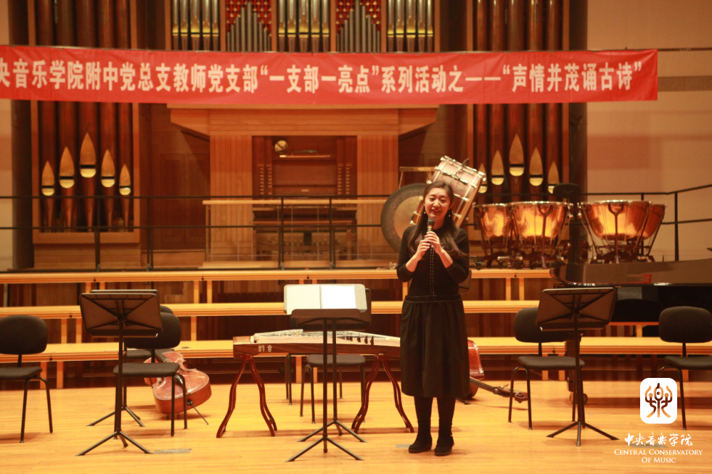 “声情并茂诵古诗” 是附中党总支教师党支部在“党建带团建”工作思路指导下的一次创新实践,也是支部结合自身特点,积极打造“一支部一亮点、一党员一旗帜”的系列活动之一。它力求发挥附中学生的音乐专长,以“和诗咏歌”的形式,给音乐赋予诗词能量,延续经典的生命力,通过诵唱让学生在潜移默化中接受诗词的熏陶,产生对美好生活的期待,对古典文化怀揣敬畏,感受中华文化的博大精深,从而更加热爱祖国和民族文化,最终在实践中探索符合音乐院校特色的传统文化教学模式。这些不同于知识灌输式的创新形式是学生喜闻乐见的——亘古绵延的“古老”知识,与富有巧思的“年轻”形式交相辉映、相得益彰。
