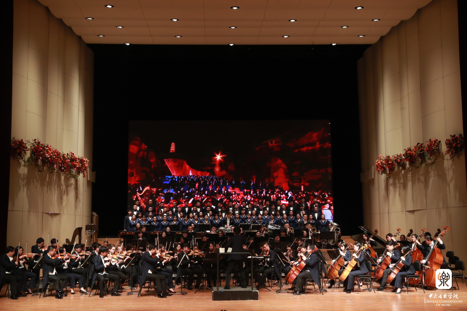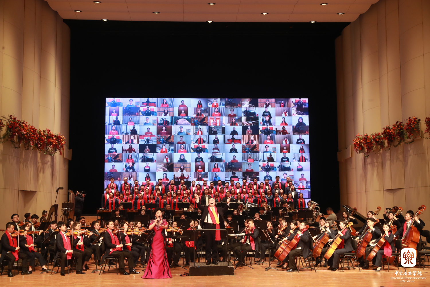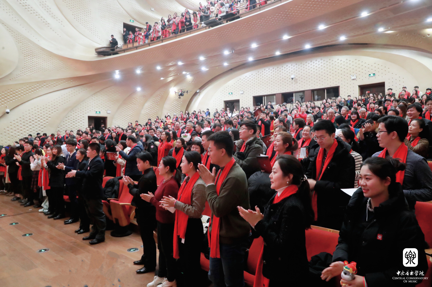“一条大河波浪宽,风吹稻花香两岸”……新年音乐会接近尾声,在俞峰院长的指挥下,全场观众起立,与大屏幕上来自全球各地校友一起,共同跟随女高音歌唱家黄华丽唱响《我的祖国》,美妙的音乐响彻歌剧音乐厅,伴随着悠扬的歌声,全场听众用熟悉的经典歌曲,抒发出心底真挚朴实的爱国之情。