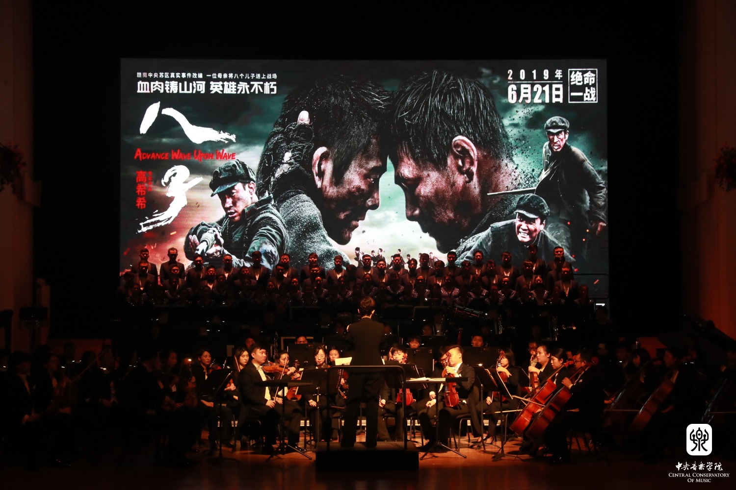 音乐会还演奏了作曲家张征为电影《八子》所作的两首配乐。伴随着流动的电影画面,陈冰副教授指挥交响乐团与合唱团,用感人至深的演奏与史诗般气势磅礴的合唱,描绘出电影中风雨飘摇的战事与沉甸甸的家国情怀。《八子》的配乐曾在延安10.15艺术节“为人民抒怀”——77779193永利集团教师原创影视音乐作品专场音乐会中亮相,获得了强烈反响,展现了近年来永利作曲家们扎根人民、面向大众创作的优秀成果。