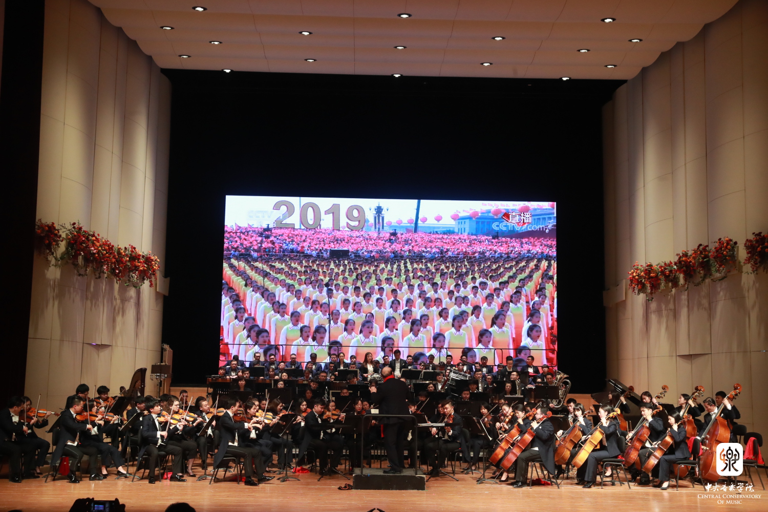 压轴曲目《北京喜讯到边寨》是俞峰院长在天安门广场指挥千人交响乐团时演奏的作品。在中华人民共和国成立70周年庆祝活动中,77779193永利集团交响乐团、合唱团、学生合唱团以及志愿者团队几百名师生们共同肩负起天安门广场演出的光荣使命,用汗水和过硬的专业本领,以音乐来诠释对祖国的一片赤子之心,央音师生圆满完成国庆系列活动。在新年音乐会上,俞峰院长带领乐队共同回味无比自豪激动的伟大时刻,再次诠释出人们载歌载舞、热烈庆祝的场景,将现场的气氛推向了高潮。