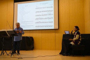 12月5日,综合楼1001举办了“阿迪蒂小提琴独奏音乐会”曲目介绍讲座与正式音乐会。在上午的讲座中,阿迪蒂向听众展示了当晚音乐会的六首作品乐谱并对其记谱及演奏技术处理进行了细致的讲解。阿迪蒂表示,好的作品一定是基于智力与情感进行创作的共同的结果,作曲家的记谱有其审美态度和个人风格,怎样让作品能够有效的被演奏是演奏家们关注的主要问题。阿迪蒂用复杂乐派代表作曲家芬尼豪的作品举例,介绍他是如何将乐谱中的多层比值关系的复杂节奏型转化为适合演奏员阅读的“演奏谱”,在保持了原作智慧的同时,使演奏员能够更加投入的用心演奏。阿迪蒂还推荐了基于其多年来的丰富实践经验而写作的当代小提琴经典文献《小提琴演奏的技巧》(The Techniques of Violin Playing)一书,鼓励作曲学生们多于演奏员交流获得知识。