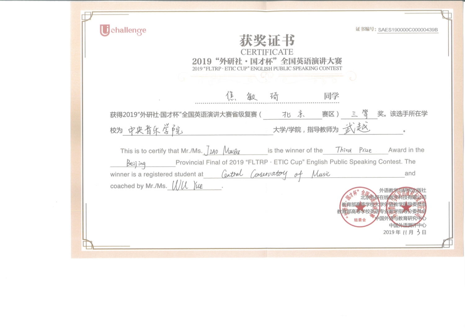 焦敏琦 演讲比赛证书