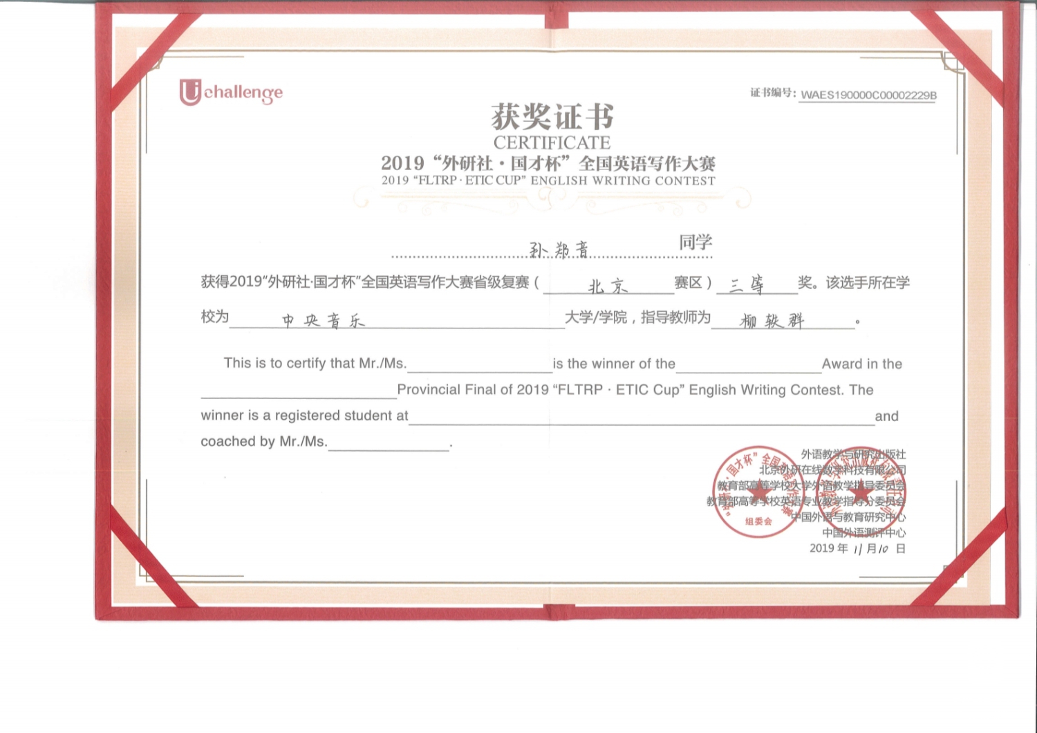 孙郑音 写作比赛证书