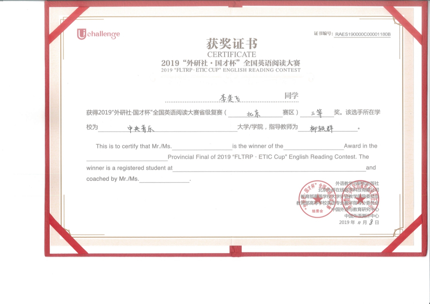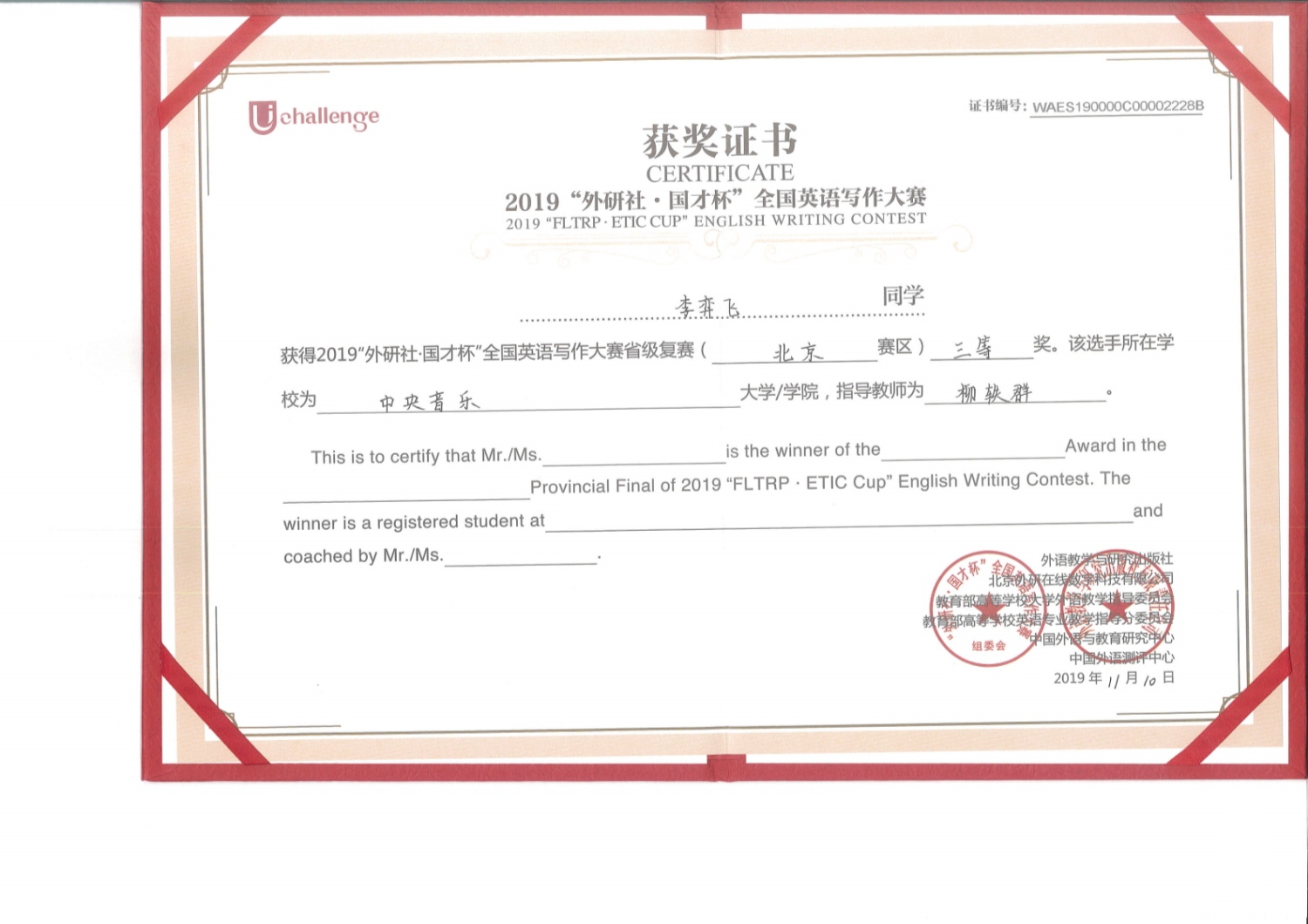 2019年12月“外研社•国才杯”全国英语写作、阅读和演讲大赛(北京赛区)复赛,以及演讲大赛网络赛场落下帷幕。永利共有5位同学代表学校参加北京赛区各类复赛并获奖;此次“外研社·国材杯”全国英语演讲比赛同步开启境内网络比赛,永利大一新生林梓琦首战即胜,闯入网络赛场决赛赛场,这是永利历史上境内学生首次闯入演讲比赛的决赛环节,实现了永利英语教学历史上又一个新突破。此次2019“外研社·国才杯”英语大赛永利获奖选手完整名单如下: