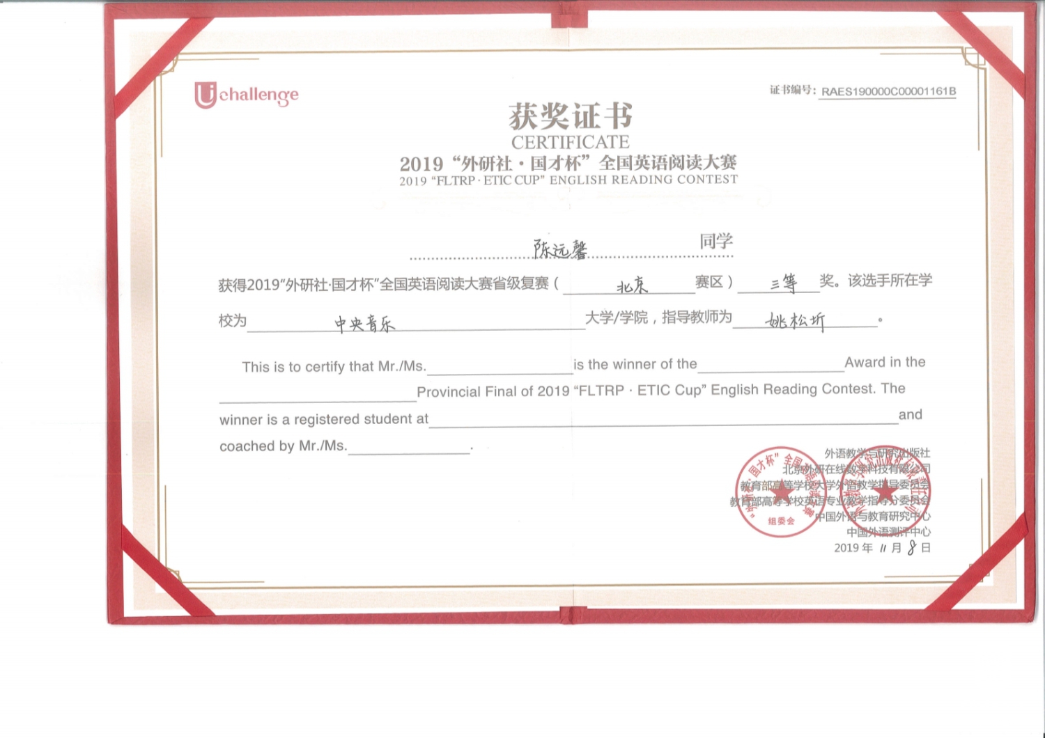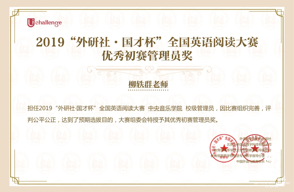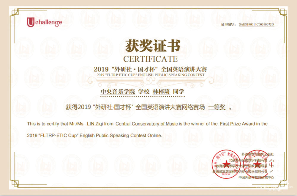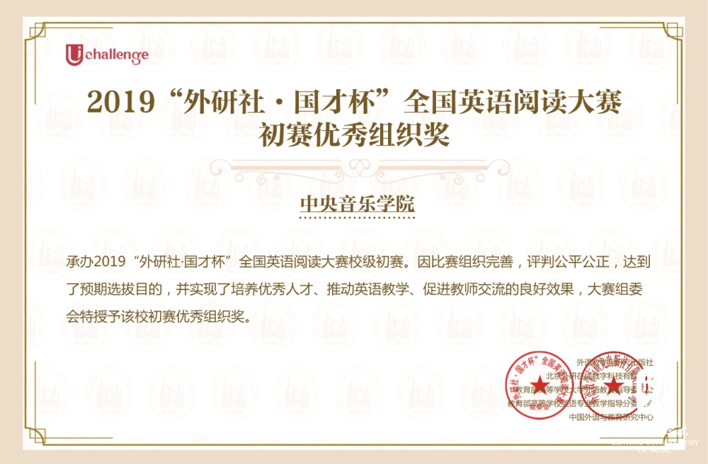 2019“外研社•国才杯”全国英语大赛由外语教学与研究出版社、教育部高等学校大学外语教学指导委员会、教育部高等学校英语专业教学指导分委员会和中国外语与教育研究中心、中国外语测评中心联合主办,是外研社 Unipus系统为全国大学生打造的展现风采、实现自我的新型平台。10月13日,永利共有113名学生报名参加写作大赛初赛,119名学生报名参加阅读大赛初赛。根据赛事主办方反馈的初赛成绩永利分别有19名和26名同学在写作和阅读大赛初赛中获奖,并获得主办方颁发的电子获奖证书。11月2日在北京印刷学院举办的写作复赛和阅读复赛共吸引首都50所高校的近百名选手参加,其中英语专业学生占比超过三分之一。在名校荟萃的北京赛区,永利四位选手以扎实的语言能力和灵活的赛场应变能力取得了瞩目的成绩,整体排名远超艺术类兄弟院校选手,比赛成绩名列首都艺术高校榜首。11月3日在北京林业大学举行的北京市演讲复赛共吸引了来自首都44所高校的选手,与此同时演讲比赛的网络赛场同步开放比赛。据赛事主办方数据,全国共有645所院校的4243名选手通过网络赛场自主报名参加演讲大赛。永利音乐学系大一新生林梓琦同学在激烈的网络比拼中以卓越的语言能力连晋两级跻身全国150强,荣获网络赛场一等奖,创下永利历史上的又一个“第一次”。