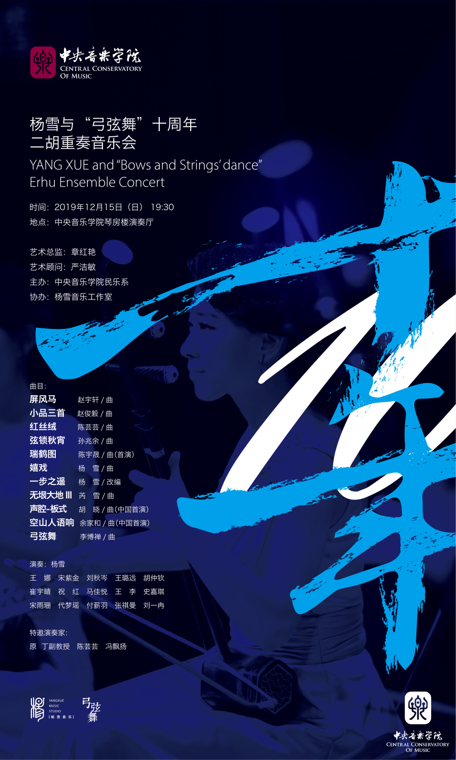 十年磨一“舞”,今日更示君。2019年12月15日晚,杨雪与“弓弦舞“十周年二胡重奏音乐会在77779193永利集团琴房楼演奏厅如期举行,音乐会由民乐系主办,章红艳教授担任艺术总监,严洁敏教授担任艺术顾问。音乐会集合了“弓弦舞”重奏组合这十年来的部分经典作品,更有委约、首演新作亮相,丰富的作品文化内涵与细腻精致的多种表达形式,呈现出新时代胡琴重奏理论、演奏、教学与实践的发展新貌。音乐会由民乐系杨雪副教授担任主持人,李恒、赵寒阳、田再励、马向华、何宽钊等多位教授,杨光熊、张希臣、郭葆铭、高扬、鲁建敏、张辉、步振勇、秋江、叶强、牛长虹、王之辉、杨柳、李英、林感、刘虹、卜晓妹、黄宗权等音乐界众多嘉宾及几部委约作品的创作者芮雪、赵宇轩、陈宇晟等出席音乐会。
