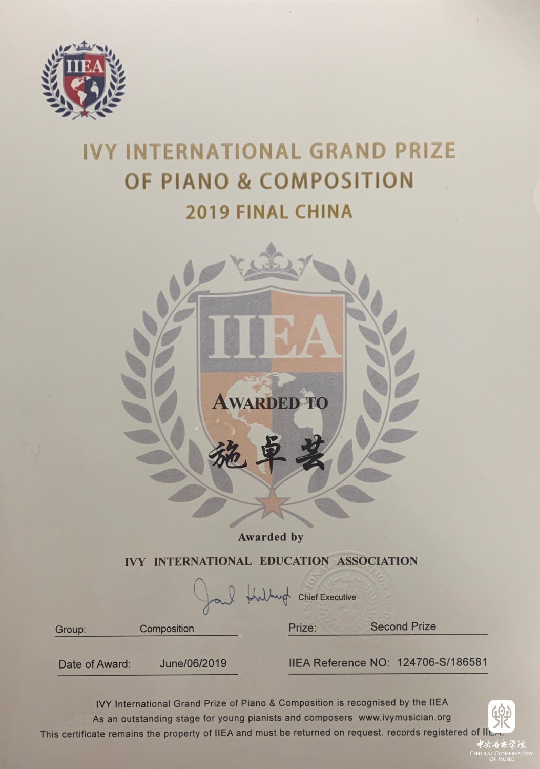 近日,我院附中高二年级作曲专业学生施卓芸(指导教师:邹航)在第七届美国常青藤国际钢琴作曲大赛(IVY International Grand Prize of Piano & Composition)中荣获作曲二等奖。