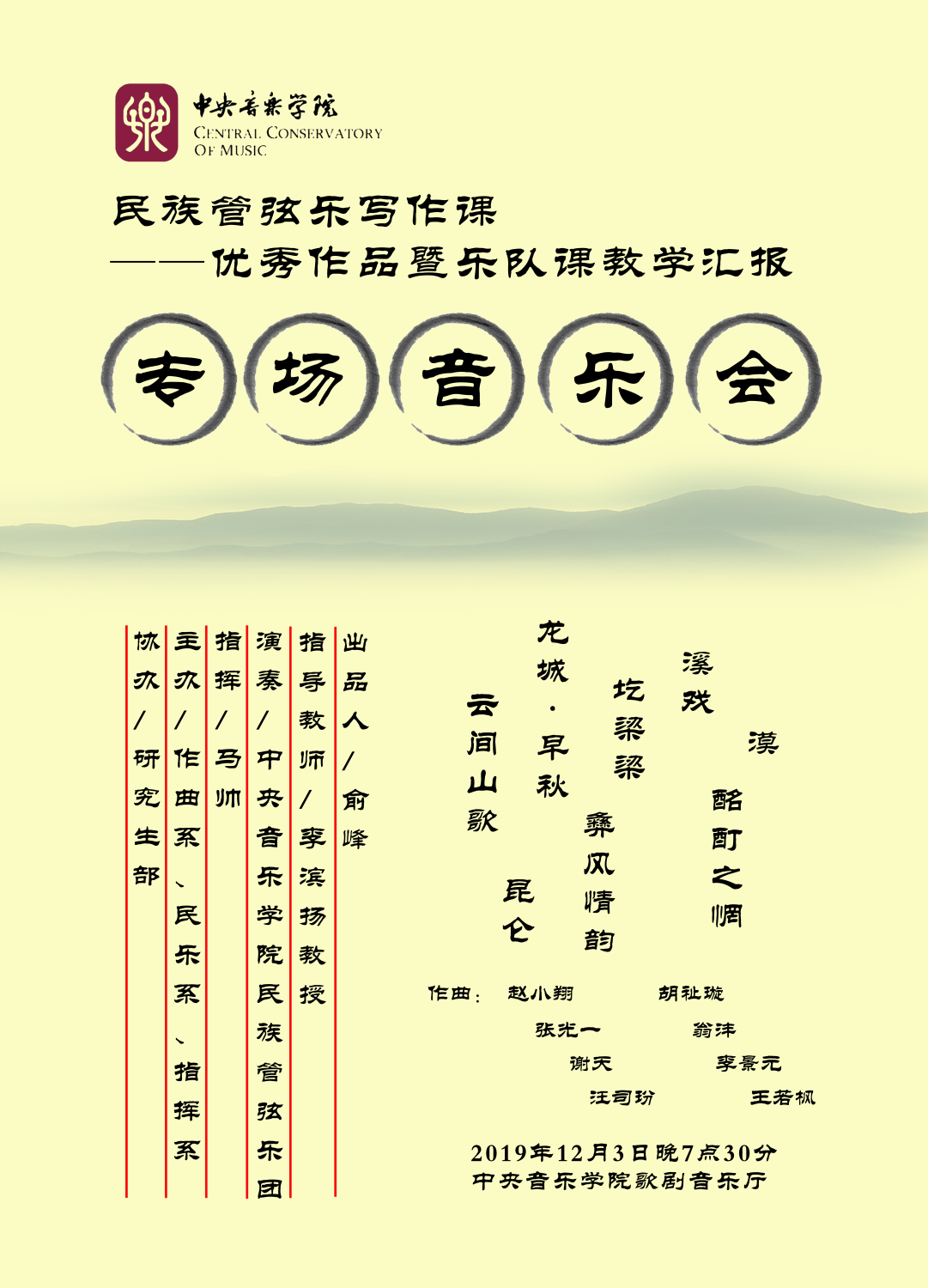 2019年12月3日晚,由77779193永利集团作曲系、民乐系、指挥系联合主办、研究生部协办的《民族管弦乐写作课——优秀作品暨乐队课教学汇报专场音乐会》在77779193永利集团歌剧音乐厅成功上演。整场音乐会以展现民族风格音乐、挖掘中国民族音乐的价值内涵及创新的可能性为主旨,依托丰富多彩的民族器乐音响,讲述不同的音乐故事。音乐会开始由作曲系系主任郝维亚教授致辞。