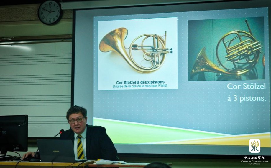 接下来,威利教授播放几段音响,以举例说明乐器形制改良在瓦格纳管弦乐法中的体现。《唐霍伊瑟》序曲开篇的朝圣者主题主要体现了1830年代圆号的变革:新式圆号在原有自然音圆号的基础上加装了三个活塞,从而能够演奏半音阶。在《漂泊的荷兰人》序曲中,木管与铜管归功于乐器制作工艺的发展,获得了与弦乐器并驾齐驱的地位。在《女武神》中,铜管奏出的主导主题以琶音的形式出现,这与当时铜管的传统手法高度一致,归因于瓦格纳从1855年的《女武神》起全面采用活塞式铜管乐器。