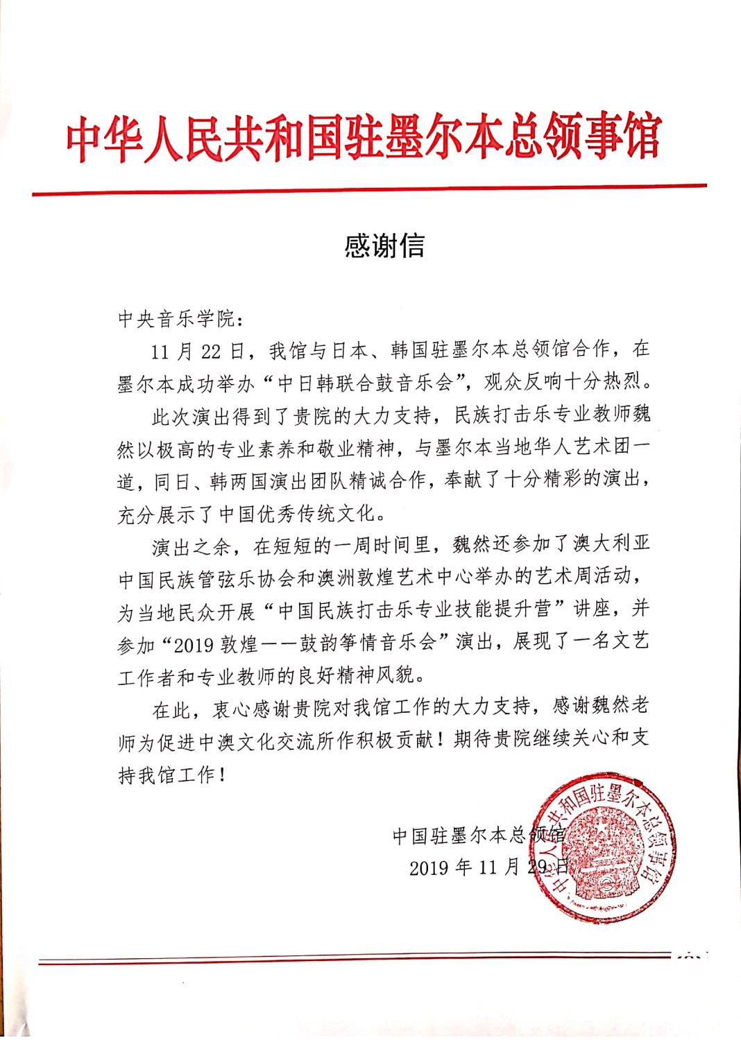 11月16日-28日,永利民族打击乐青年教师魏然,应中华人民共和国驻墨尔本总领事馆邀请,赴墨尔本参加《中日韩三国鼓音乐会》,并举办公开讲座。