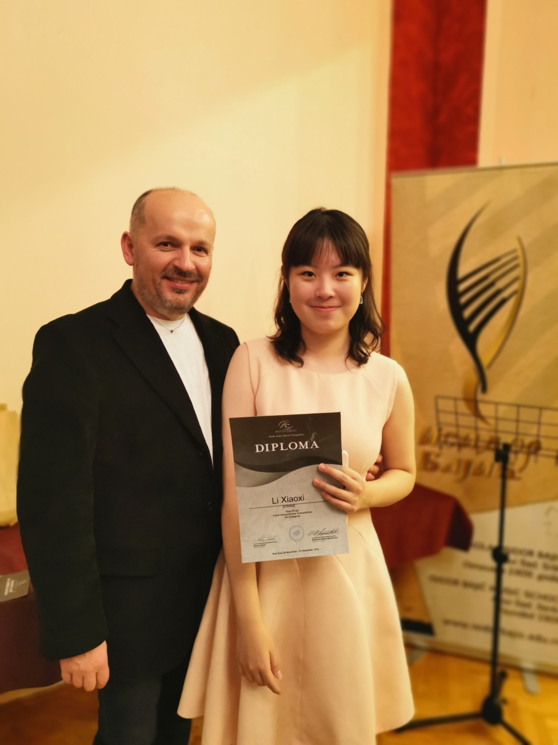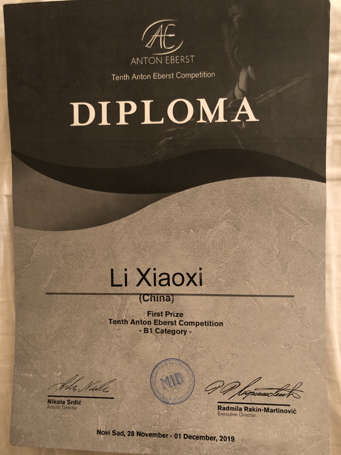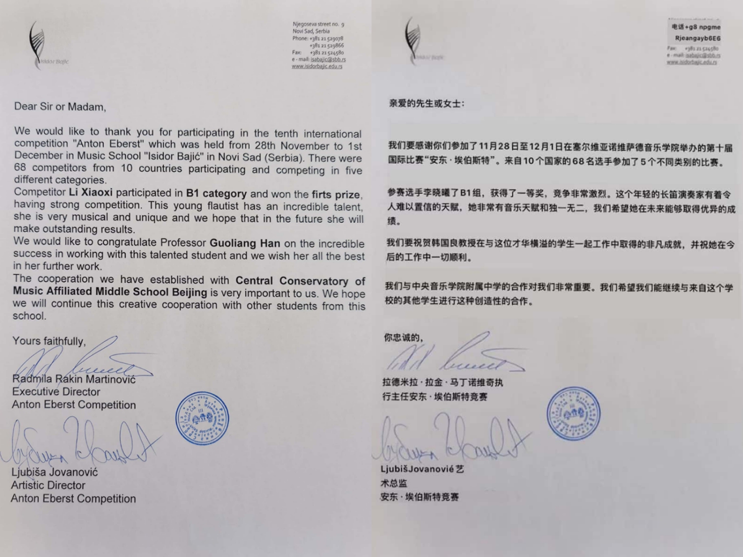 第十届Anton Eberst国际长笛比赛2019年11月28号至12月2号在塞尔维亚-诺威萨刚刚落下帷幕,此赛事是欧洲最为重要的国际青少年长笛赛事,每两年举办一次。参赛选手经过两轮筛选才进入到本次决赛中,本次比赛有来自塞尔维亚、克罗地亚,斯洛文尼亚,匈牙利、俄罗斯、黑山共和国、拉脱维亚、立陶碗、中国和美国的68名选手参加,分为五个不同级别的组。经过5天的激烈角逐,永利附中初三学生李筱熹荣获B1级别组第一名!指导教师:韩国良、刘晔。