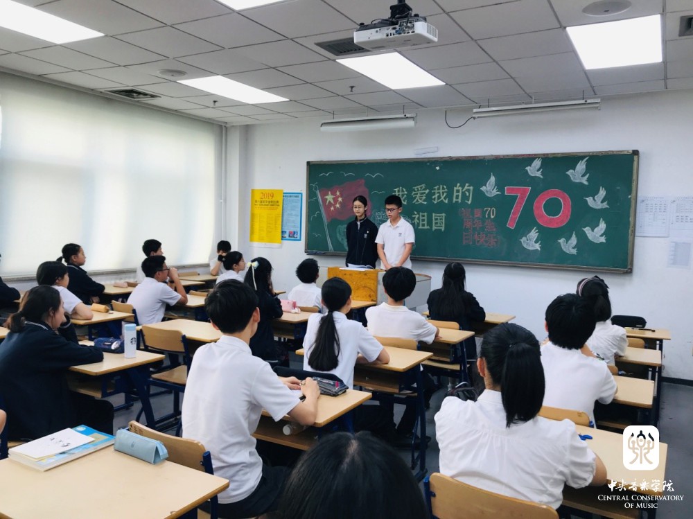 校园文化彰内涵。校园文化建设是附中共青团工作的重要内容。主题教育开展以来,附中党总支深入推进党建带团建工作,积极为学生搭建平台,通过演出、作品展示、主题班会等形式,营造了浓郁的校园文化氛围,提升了学生的综合能力。在附中团总支的具体组织下,围绕庆祝中华人民共和国成立70周年的爱国主义教育主题,学生以班级和年级为单位,多次开展主题班会及年级活动,内容详实、生动,形式多样,如聆听爱国歌曲、举办有奖知识问答、回顾新中国成立历史、举办国庆主题绘画班会等。
