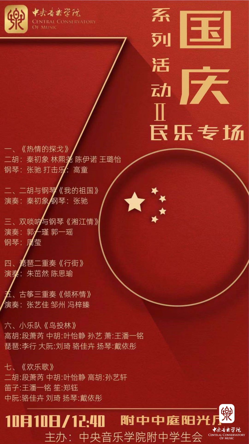 由团总支牵头、学生会组织的国庆系列演出,借“阳光房音乐会”平台,以独奏、重奏、小型乐队、民乐专场等形式进行展示,向伟大祖国献礼。