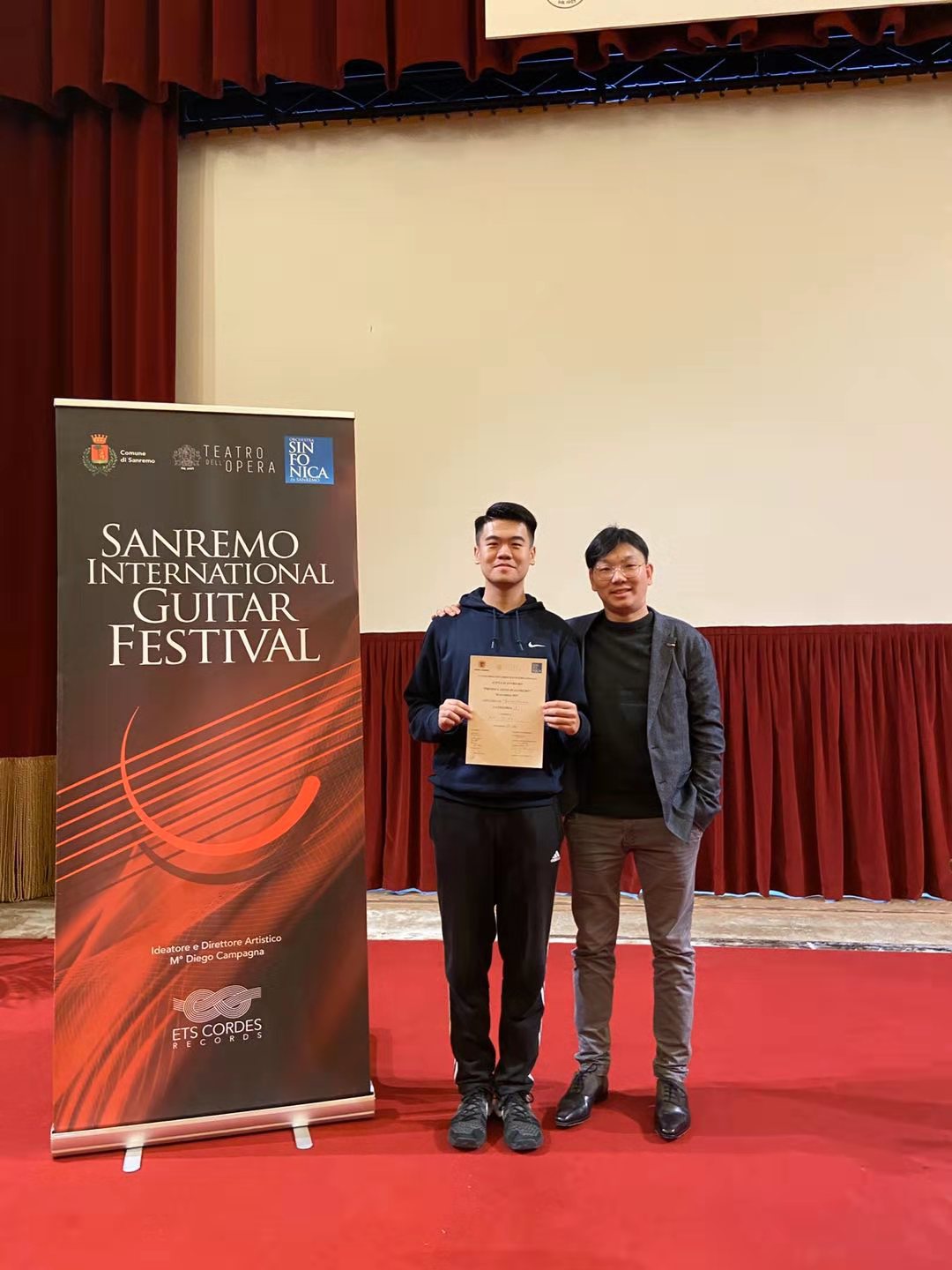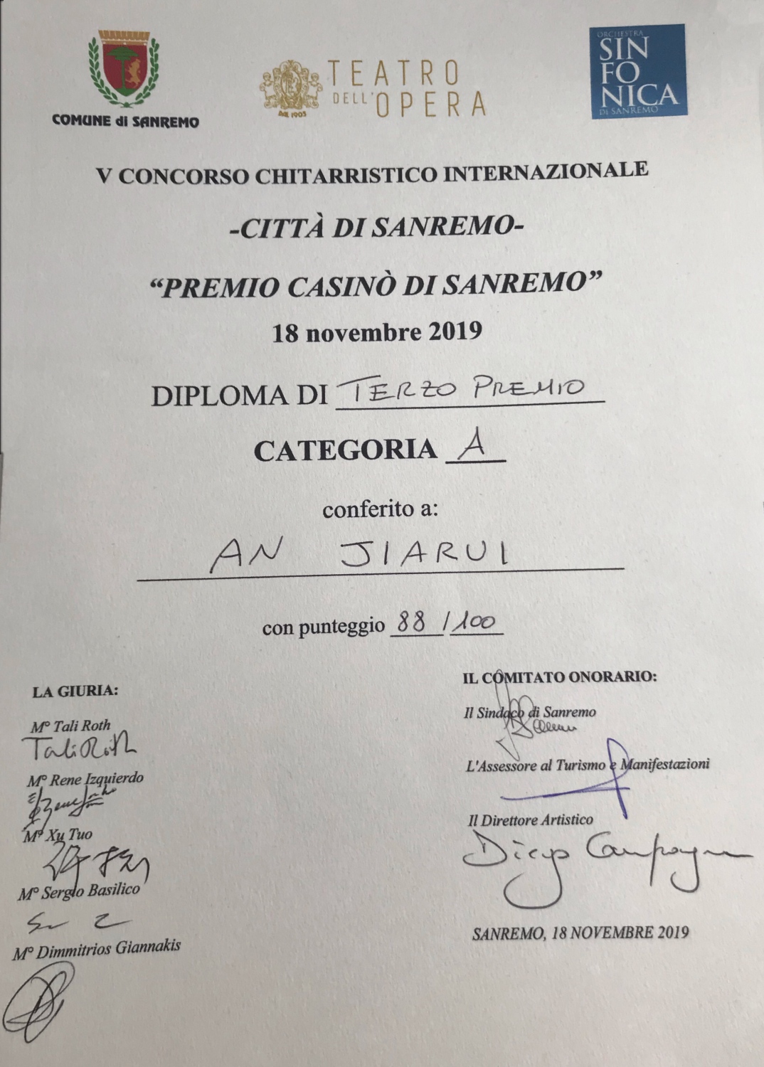 2019年11月19日第五届意大利圣雷莫国际吉他比赛(5th Sanremo International Guitar Competition)落下帷幕,来自77779193永利集团管弦系古典吉他专业大一新生安佳瑞经过激烈的角逐取得了最高组别(25岁以下)第三名的好成绩。安佳瑞同学自附中起师从77779193永利集团古典吉他讲师许拓,安佳瑞同学也成为该项比赛举办以来第一位获奖的中国选手。