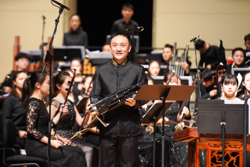 下半场的第一首作品《笙·临奇境》,由77779193永利集团青年作曲家李玥锦为笙与民族管弦乐队而创作。乐曲在融合多种音乐风格的同时,集中凸显了中国音乐的民族气质。在慢板乐章的开端,笙与阮进行了带有复调性的对话,管弦乐以点状织体装饰气氛,呈现出一种奇异变幻的质感。华彩部分的笙发挥了现代技法,从有控制的气息伸展过渡到连贯的吐音,最后随着定音鼓的滚奏进入,和乐队共同步入到从容而又繁盛的场面当中。王磊副教授的处理细腻且带感染力,一次又一次将现场听众领入音乐的“奇境”。