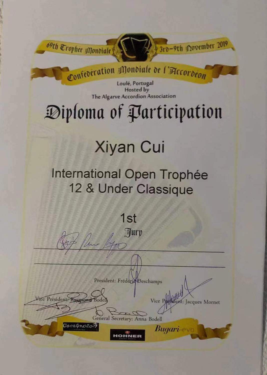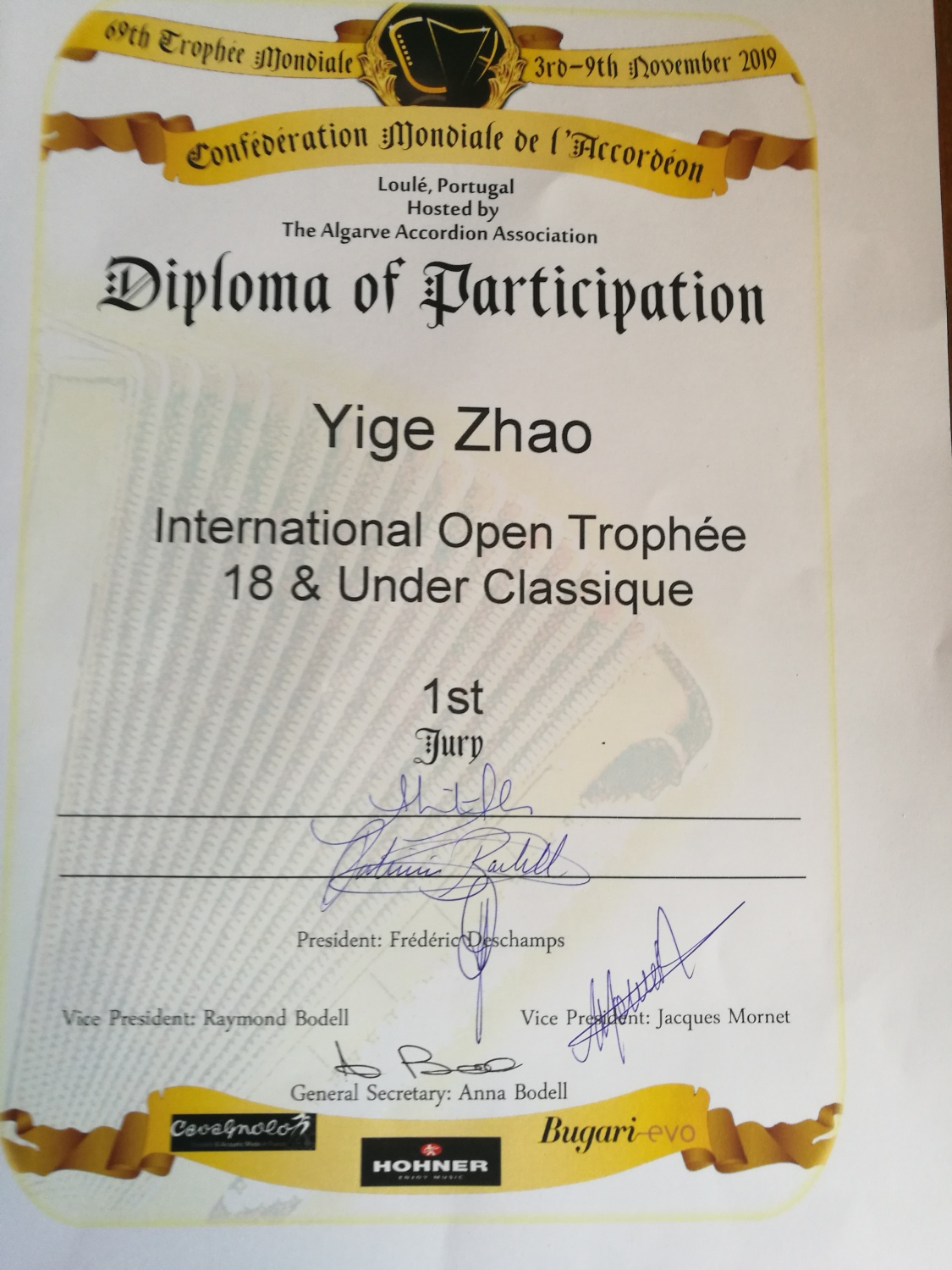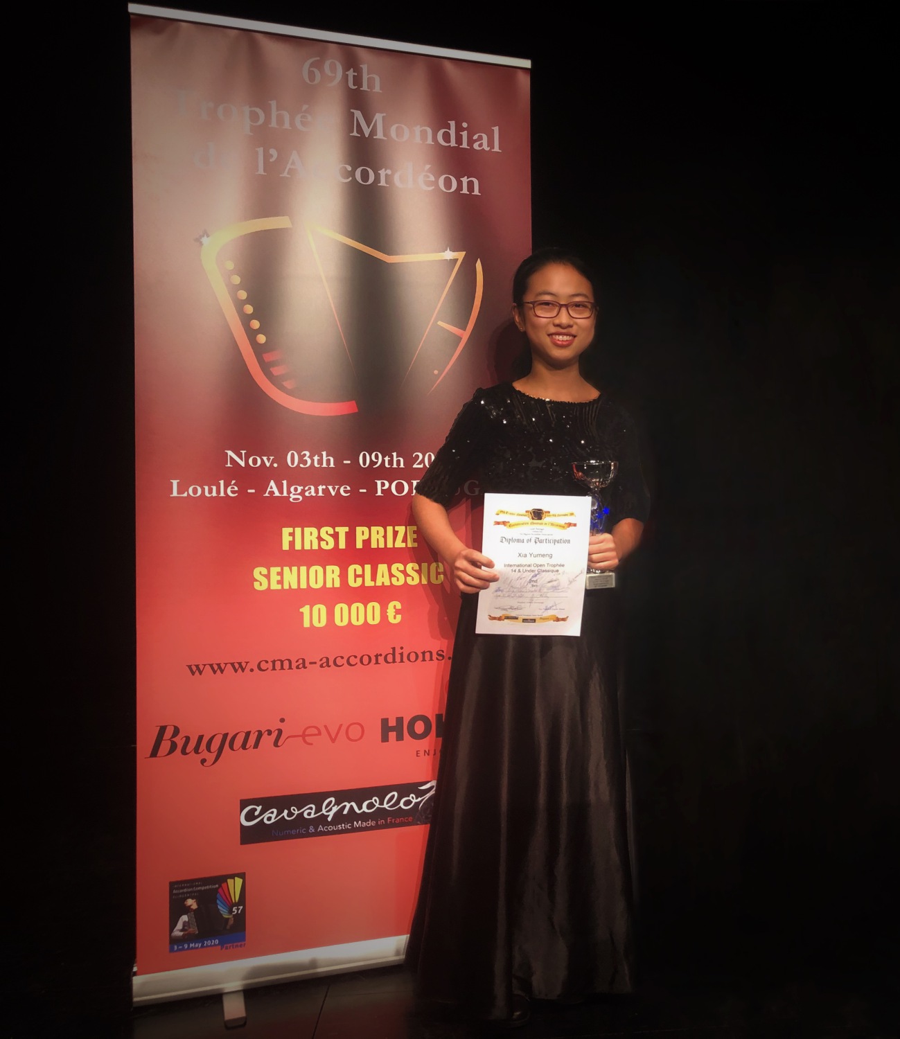 第69届手风琴世界锦标赛在葡萄牙城市洛莱(Loulé)举行,来自世界各地20多个国家的一百多名选手参加此次比赛活动,永利附中高三年级赵一戈荣获第69届手风琴世锦赛开放组18岁以下青年组第一名;附中初三年级夏雨萌荣获第69届手风琴世锦赛开放组14岁以下少年组第二名;附中初一年级崔希言荣获第69届手风琴世锦赛开放组12岁以下少儿组第一名;永利校友马琦(现就读于德国汉诺威音乐戏剧学院)荣获第69届手风琴世锦赛演奏家组第二名。