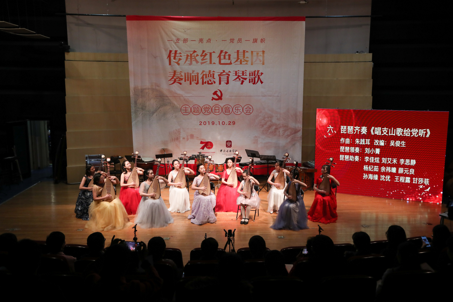 灯光凝聚,琴声共鸣,民乐系师生党员、积极分子以一曲《欢庆》拉开音乐会帷幕。讲演、启迪、探索、思考,每一位党员教师都以各自专业为立足点,结合时代背景、中国精神,为在场的观众们呈现了一堂精彩纷呈的音乐思政课。