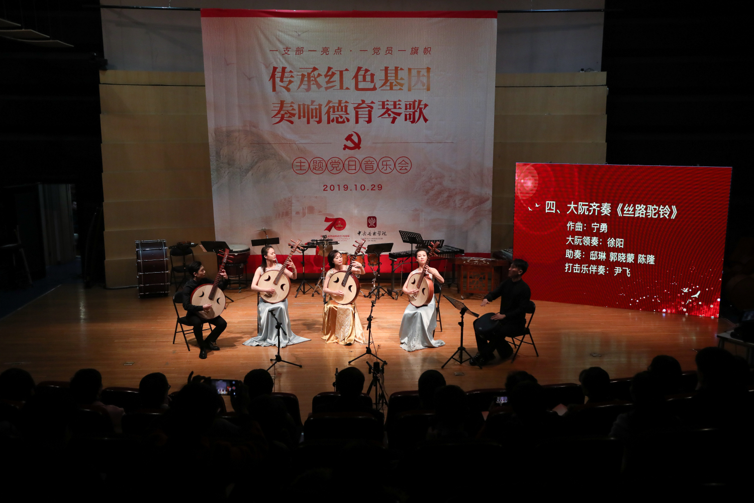 田再励教授结合亲身经历向观众分享了他对于“不忘初心,牢记使命”的感悟,通过讲述高胡独奏曲《山乡春早》的创作背景以及恩师蓝玉菘先生的人生经历,鼓励在场的学生坚持学习、不懈努力,为人民服务、为国家贡献力量;杨守成教授为观众介绍了笙曲《沂蒙山歌》的背景,随后党总支副书记王磊副教授结合此曲的由来与意义,以“用艺术谱写初心,用音乐传承使命”进一步明确了此次音乐会的主旨与目的,与民乐系辅导员王一老师、扬琴教师马英俊共同演奏了此曲;徐阳教授讲历史,谈诗词,从阮的诞生故事谈到民族音乐肩负的民族融合与向世界弘扬中国文化的重任,带领着附中民乐学科党员教师邸琳、民乐系入党积极分子打击乐教师尹飞、77779193永利集团民族室内乐团阮演奏员郭晓蒙及香港地区学生陈隆共同演绎了阮合奏《丝路驼铃》,以此鼓励人们向着更美好的明天奋进;民乐系副系主任胡瑜副教授与二胡专业杨雪副教授、孙凰副教授、板胡教师胡穆楠、扬琴教师马英俊等5位党员教师共同演绎了根据1959年创作的板胡曲《翻身不忘共产党》改编而成的二胡曲《翻身歌》。通过精彩的讲解和情绪饱满的演奏,让建国初期的经典作品在建国70周年时再次焕发新貌,为建国70周年献礼;“唱支山歌给党听,我把党来比母亲;母亲只生了我的身,党的光辉照我心。”琵琶教师刘小菁携手附小、附中、大学学生,一起以《唱支山歌给党听》表达了对美好生活的感恩。这不仅表达了作为一名党员青年教师,要坚守前辈们拼搏成果、保持初心继续奋斗的决心,还体现了民乐系教学的传承性;石海彬教授用一曲《湘江情》为我们分享了他对于湘江的理解。湖湘文化深深影响了毛泽东、刘少奇、任弼时、彭德怀等一大批湘籍革命家,影响着以雷锋为代表的湘籍英模。毛泽东同志正是立于橘子洲头,发出了“问苍茫大地,谁主沉浮?”的仰天长问与“到中流击水,浪遏飞舟”的豪情壮志。代代传承,生生不息,是民族音乐也是民乐系最显著的特点。由作品拓展而来,思索于今日,石海彬教授更是谈到,作为一名共产党员、一名新时代人民教师,立德树人责任重大,使命光荣。培养理想信念坚定、爱国情怀深厚、知识见识丰富、身心健康成长的青少年是党员教师的责任与使命,不管在什么时候,为党育人的初心不能忘,为国育才的立场,不能改!