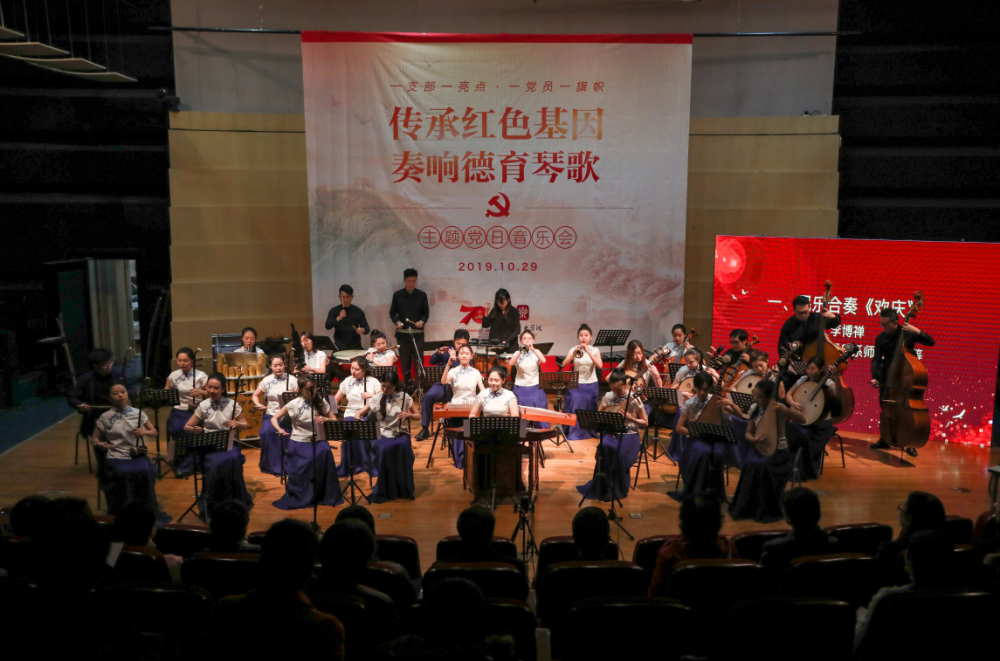 为深化践行“不忘初心, 牢记使命”主题教育活动,根据永利党委2019基层组织建设年实施细则,民乐系党员师生结合自身专业特点,于2019年10月29日成功举办“传承红色基因, 奏响德育琴歌”主题党日音乐会。教育部党建工作联络员黄华英,中国教育电视台党委书记柯春晖,中国教育电视台副台长吕学武,77779193永利集团党委书记赵旻,党委副书记、纪委书记刘春梅,副院长于红梅,民乐系主任章红艳,统战部部长兼党办主任赵晓岩,组织部部长齐雅娜,宣传部部长刘红柱,作曲系党总支书记陈泳岗,离退办主任兼工会副主席王文书,组织部原部长郝美芳等领导嘉宾与音乐界专家教授及在校师生等观众一同观看了此次饱含深情、充满新意的音乐会。