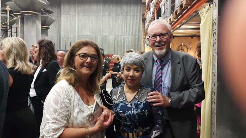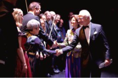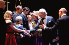 庆典音乐会结束后演员在后台庆祝时迪里拜尔与歌剧院导演热情合照