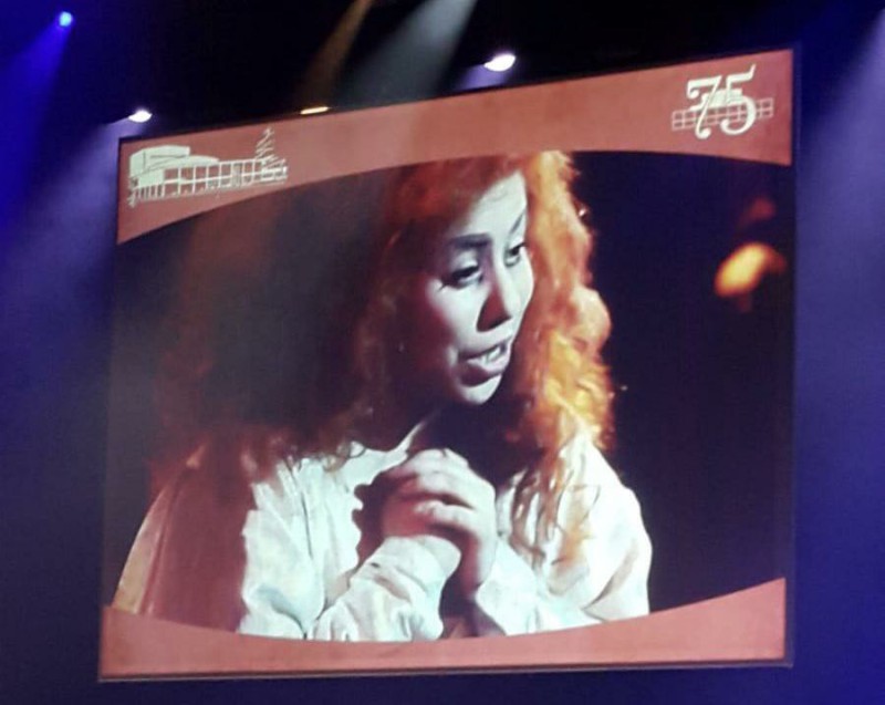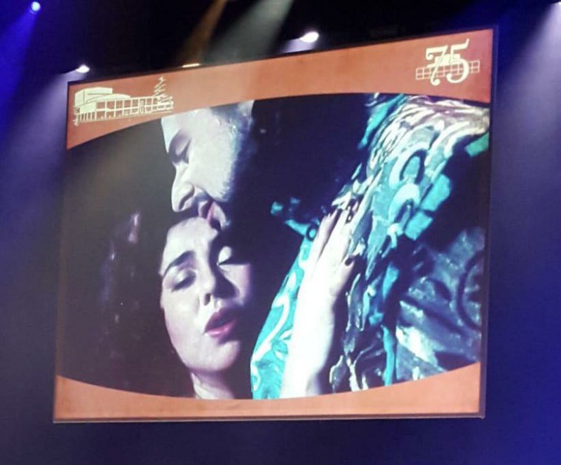 庆典音乐会中,青年歌唱家们演唱歌剧《弄臣》选段,大屏幕中播放着当年由迪里拜尔主演的歌剧《弄臣》中与瑞典著名男中音歌唱家法勒克曼的剧照。