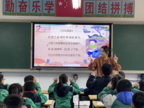 19日上午,音教学院老师带领同学们分成三个小组,深入到志丹县城关小学、市镇小学、红军小学三所小学十八个班级,进行课堂教学实践。课堂选取《小松树》《丰收景象》《一粒米》《对花》等小学实习课本音乐作品素材,为二到五年级的同学们呈现了生动有趣的音乐综合课。志丹县的孩子们积极参与到小老师们为他们带来的音乐课,课堂气氛活跃,从他们的眼神中可以感受到孩子们对音乐的热爱与向往。