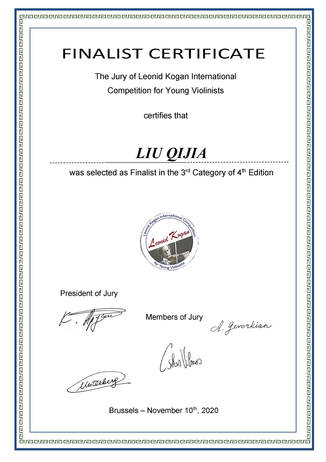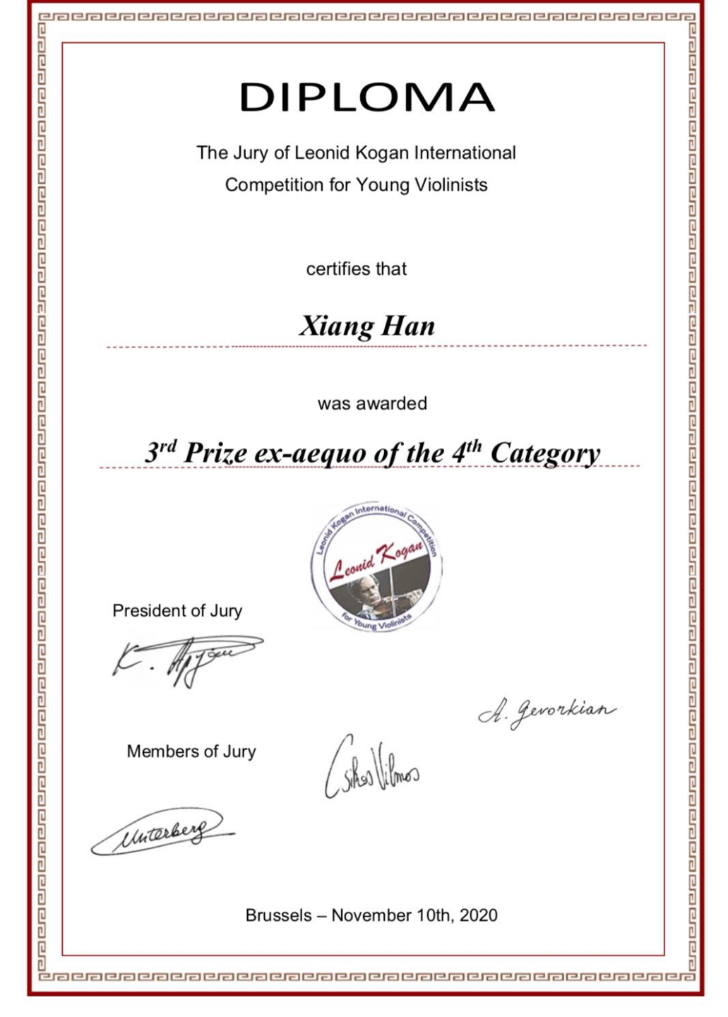 2020年11月获第4届比利时布鲁塞尔柯冈国际青少年小提琴比赛成年组第三名