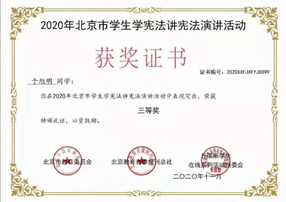 为贯彻落实习近平总书记关于宪法学习宣传教育系列重要指示精神,按照中央全面依法治国委员会任务安排和中央宣传部等部门《关于组织开展宪法学习宣传教育活动的通知》要求,北京市教委主办了2020年北京市学生“学宪法讲宪法”活动,永利附中高一年级学生于旭明在比赛中荣获演讲比赛高中组三等奖。