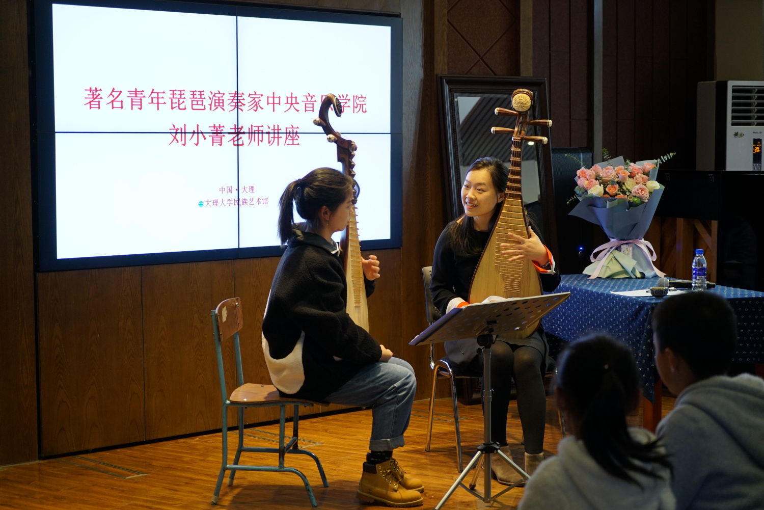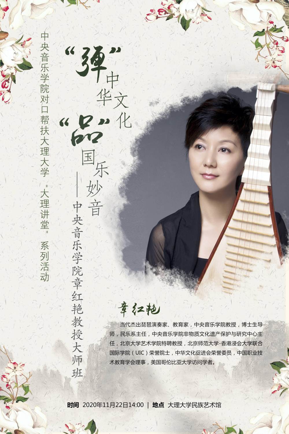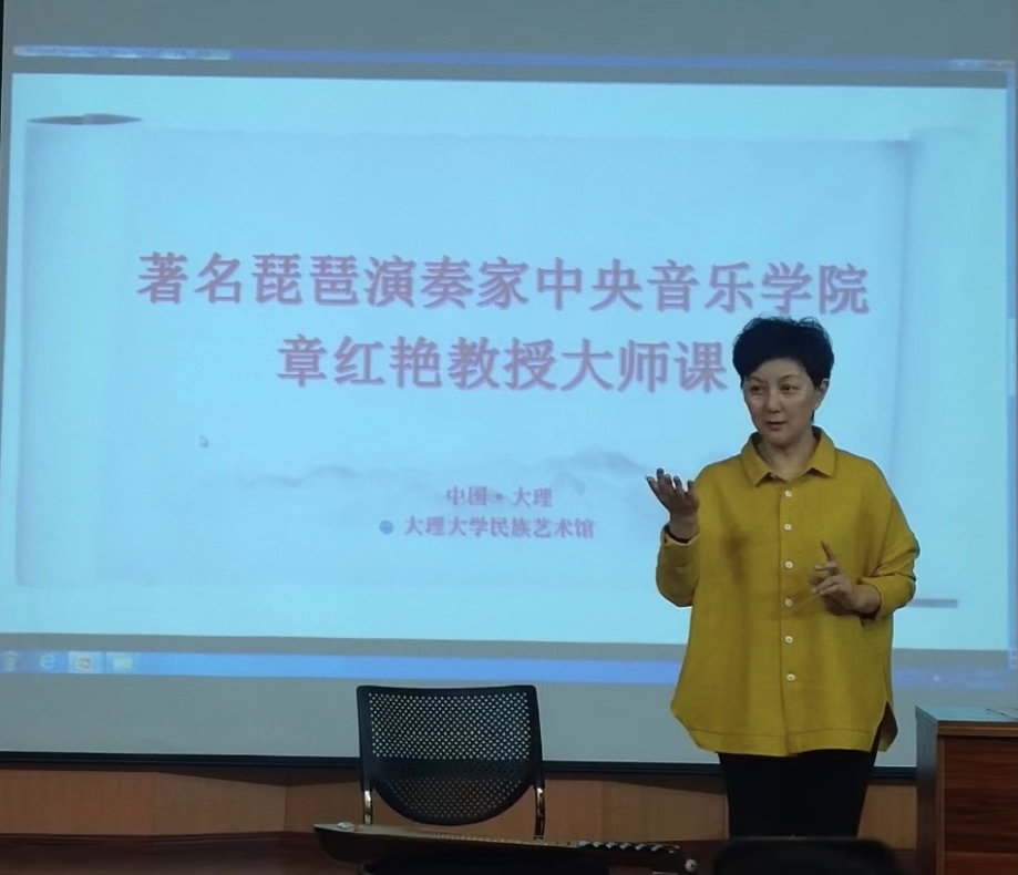 22日,在大理大学艺术学院演奏厅,由永利琵琶教授、博士生导师、民乐系主任、国家非物质文化遗产保护与研究中心主任章红艳为大理大学师生讲授了一堂“‘弹’中华文化、‘品’国乐妙音”的大师课。章红艳教授从中国传统文化谈到民族器乐发展,深入浅出的讲授了琵琶的历史根源、发展和琵琶演奏法的演进,介绍了琵琶代表性曲目和中国各个地域的作品特点。她把民族自豪与文化自信渗入其中,表现在美妙的音乐中。演奏厅内座无虚席,过道上加了一排排的小板凳,章老师演奏了《春江花月夜》《十面埋伏》等曲目把现场的观众感动的落泪。演奏厅内琴声、掌声、喝彩声交织成一部多彩的协奏曲。听课的老师也激动地说:“这是一堂艺术的洗礼课,也是一堂生动的课程思政示范课。”