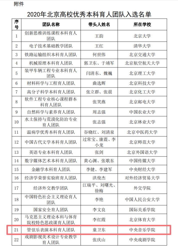 2020年5月,根据《北京市教育委员会关于开展2020年“北京高校优秀本科育人团队”和“北京高校优秀本科教学管理人员”评选工作的通知》(京教函〔2020〕149号)要求,管弦系在科研处的指导下,精心组织开展了申报工作。管弦乐表演本科育人团队作为永利音乐表演的核心教学团队之一,承担着全校管弦乐独奏、室内乐、乐队等课程教学任务。经过几代人的努力,该团队在课程建设、教书育人、教学方法与手段应用、教材编写等方面均取得了优异成绩,在国内外乐坛上产生了重大影响。经北京市教育委员会评审后,管弦乐表演本科育人团队最终脱颖而出,成为全市41个优秀育人团队之一。