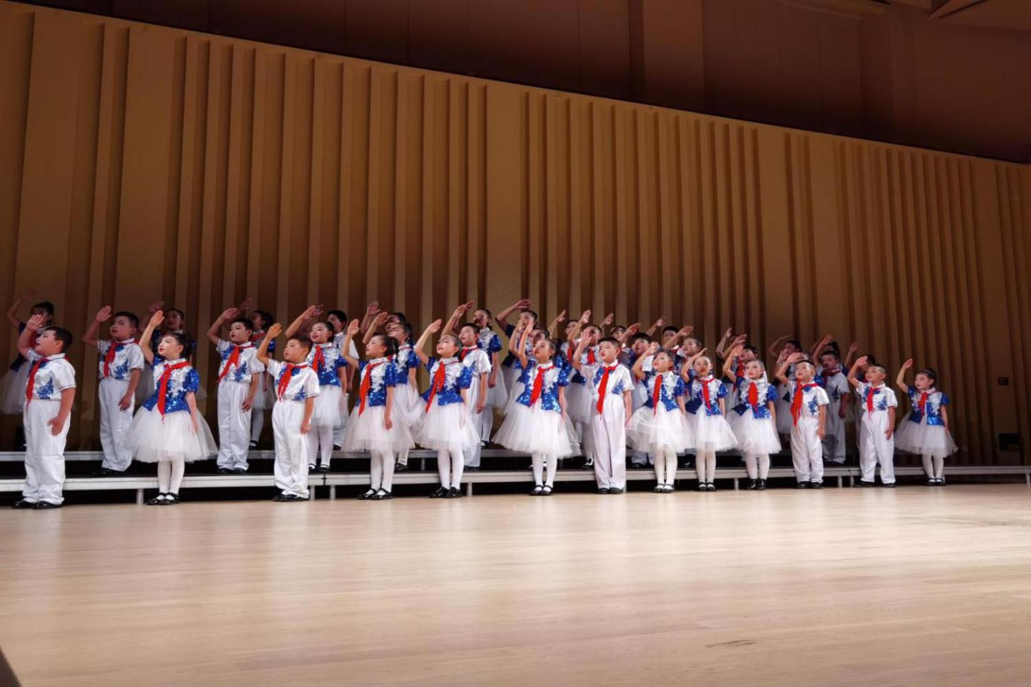 音乐会的开场是由来自延安新区清华附小、延安市宝塔区市场沟小学、延安市宝塔区中石油小学的三个班级,共122名一、二年级的学生们表演的《兴中华》,在琴声中,孩子们通过有表情的诵读,把56个民族团结奋发,海峡两岸是一家,祖国山川美如画的情景告诉大家。